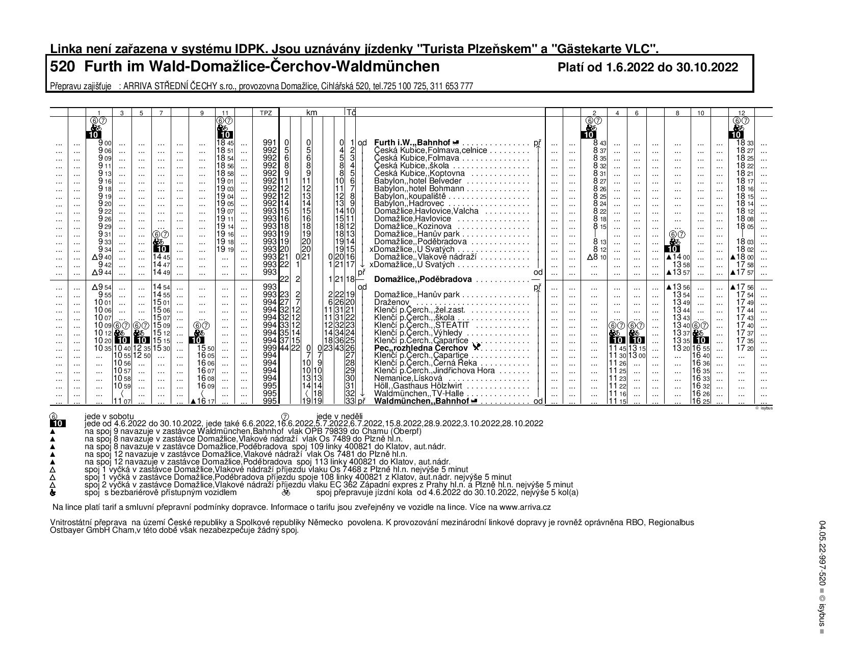 "Trasa linky 000423 se nemění a stále spojuje české území a dvě německá města, Furth im Wald a Waldmünchen přes Českou Kubici, Babylon, Domažlic nebo Klenčí pod Čerchovem. Z Capartic jezdí spoje na vrchol Čechov v 10:20, 11:30, 13:00, 15:15 a 16:40. Zpět do rozhledny dolů se vrací v 10:40, 12:35, 13:20, 15:50 a 17:20," informuje vedení města Domažlice.