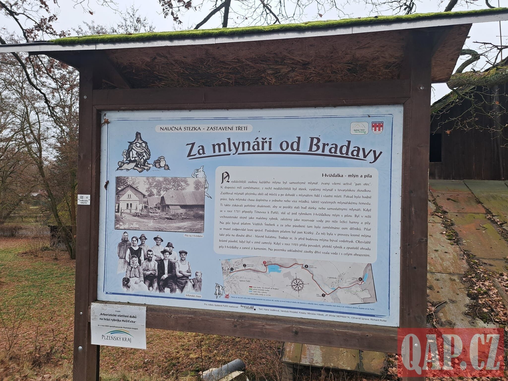 Náš výlet začíná na autobusové zastávce Spálené Poříčí, Hořehledy, kam jsme dojeli spojem z Plzně. Hned u ní se stačí napojit na zelenou turistickou značku, která vás přes mostek přivede k řece Bradavě. Tady začíná společná cesta s naučnou stezkou „Za mlynáři od Bradavy“. První úsek vede po asfaltu přímo podél řeky, která je zde úzká a vytváří fotogenická a malebná zákoutí.