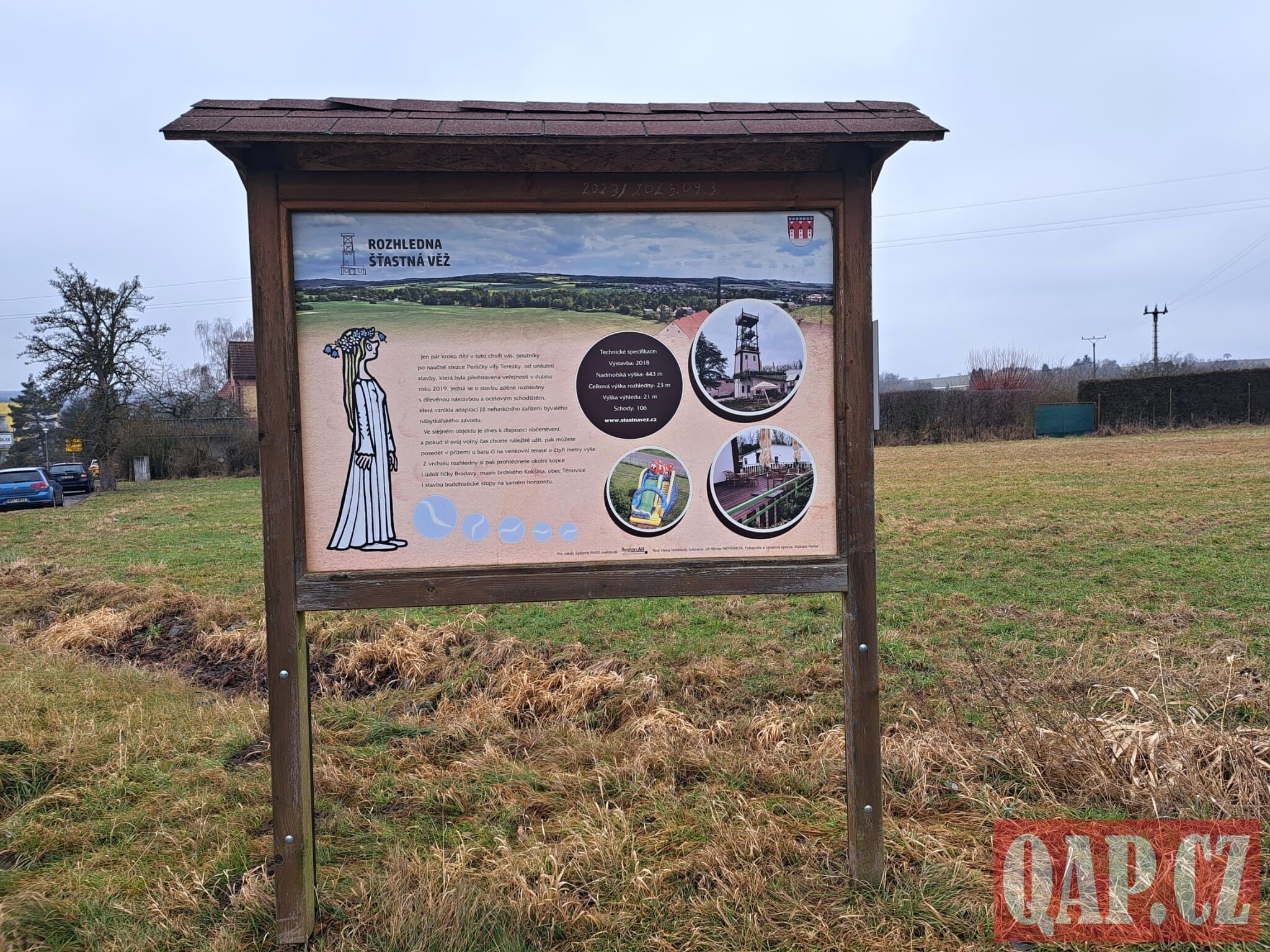 Poté cesta pokračuje po zelené až k rozcestí, kde se nachází informační cedule Rohrschmiedův či Hallův mlýn. Právě odtud jsme se vydali přes malý mostek přímo k rozhledně Šťastná věž. Zděná rozhledna s dřevěnou nástavbou a ocelovým schodištěm vznikla adaptací již nefunkčního zařízení bývalého nábytkářského závodu.