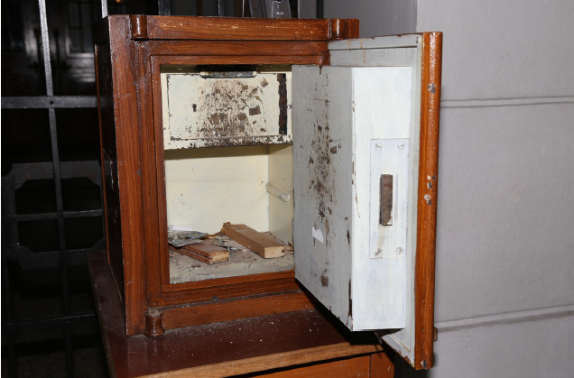 Následně pokračoval přes chodby až do samotné kaple a kanceláří. Cestou za kořistí za sebou zanechal spoušť v podobě rozbitých skleněných výplní a poničených zámků u dveří. Nakonec se mu podařilo najít klíče, kterými si otevřel pokladničky na milodary. Z nich si odnesl celkem 600 korun. Kromě toho vypáčil ještě dvě plechové pokladničky na dary, ze kterých si odnesl vždy 50 korun. Pak se ale situace prudce otočila proti němu.