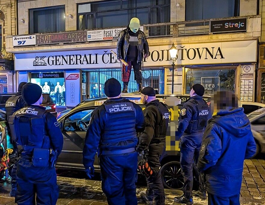 Před jedenáctou hodinou noční byly hlídky nuceny zasáhnout na náměstí Republiky. „Hlídky zde musely zasáhnout proti muži, který výrazně rušil veřejný pořádek hlasitou hudbou z reproduktorů,“ popsala Jana Pužmanová. Muž měl zakrytý obličej kuklou, v ruce baseballovou pálku a tančil na střeše nastartovaného vozidla. „Odmítal slézt dolů, nechtěl prokázat totožnost a ignoroval výzvy strážníků,“ dodala.