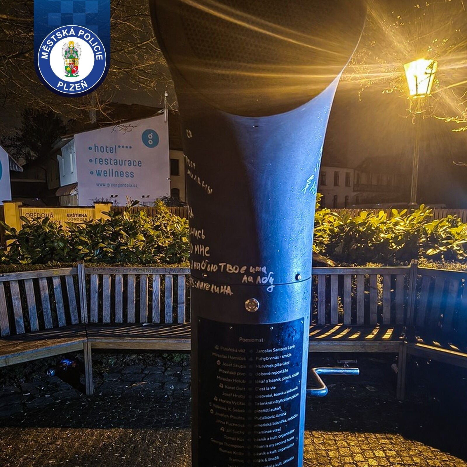 Měl lidem v parku zpříjemňovat chvíle poezií, hudbou Karla Gotta nebo fotbalovými chorály Viktorie. Místo toho se plzeňský Poesiomat v Mlýnské strouze stal terčem nepochopitelného útoku vandala. Někdo ho počmáral nápisy v azbuce a vulgárními piktogramy.