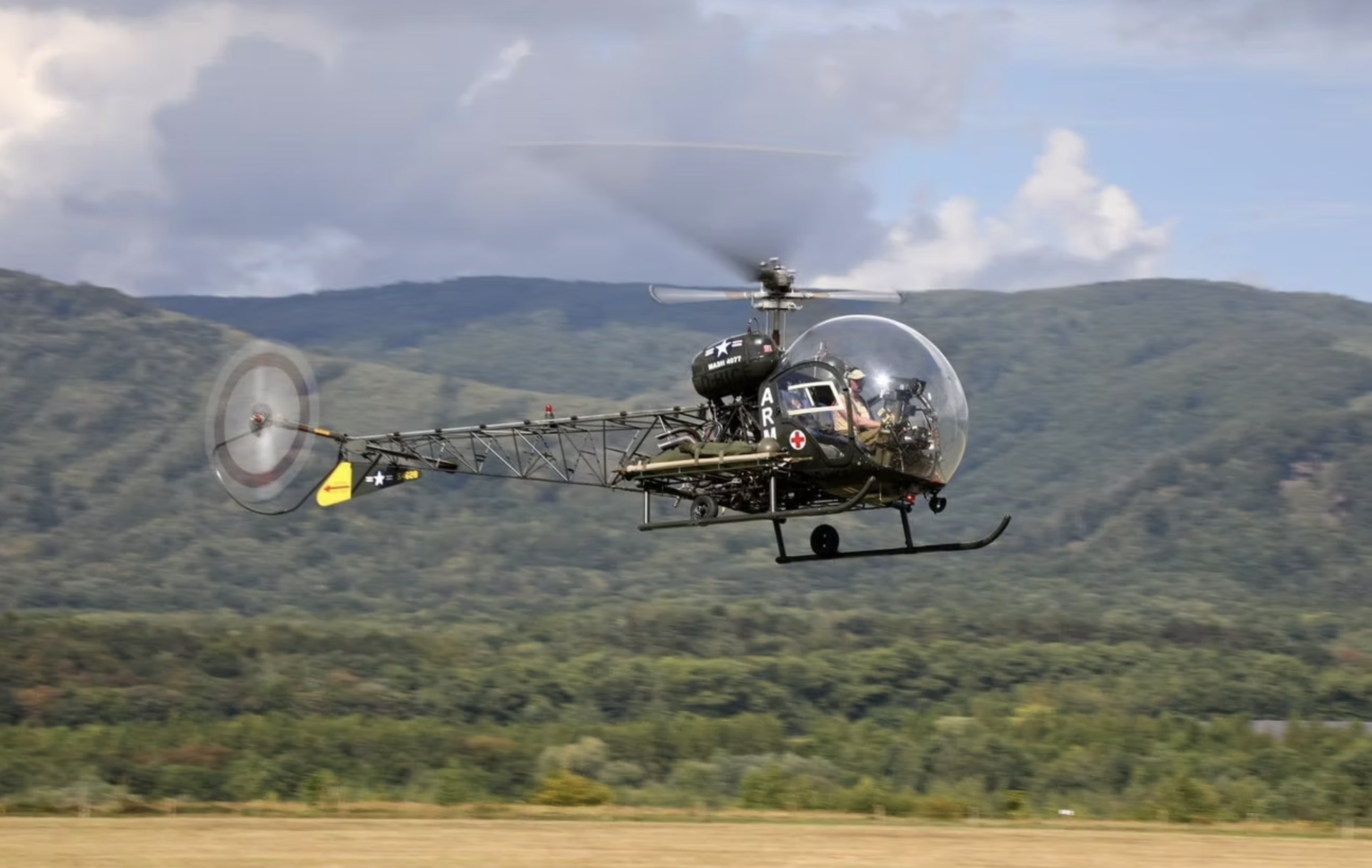 Bell 47, přezdívaný „mýdlová bublina“ díky svému unikátnímu prosklenému kokpitu, se nepředvede jen v akrobacii. V rámci pozemní show bude spolupracovat s dobovou sanitkou a diváci uvidí simulaci transportu raněných přesně tak, jak to po desetiletí fascinuje miliony fanoušků po celém světě.