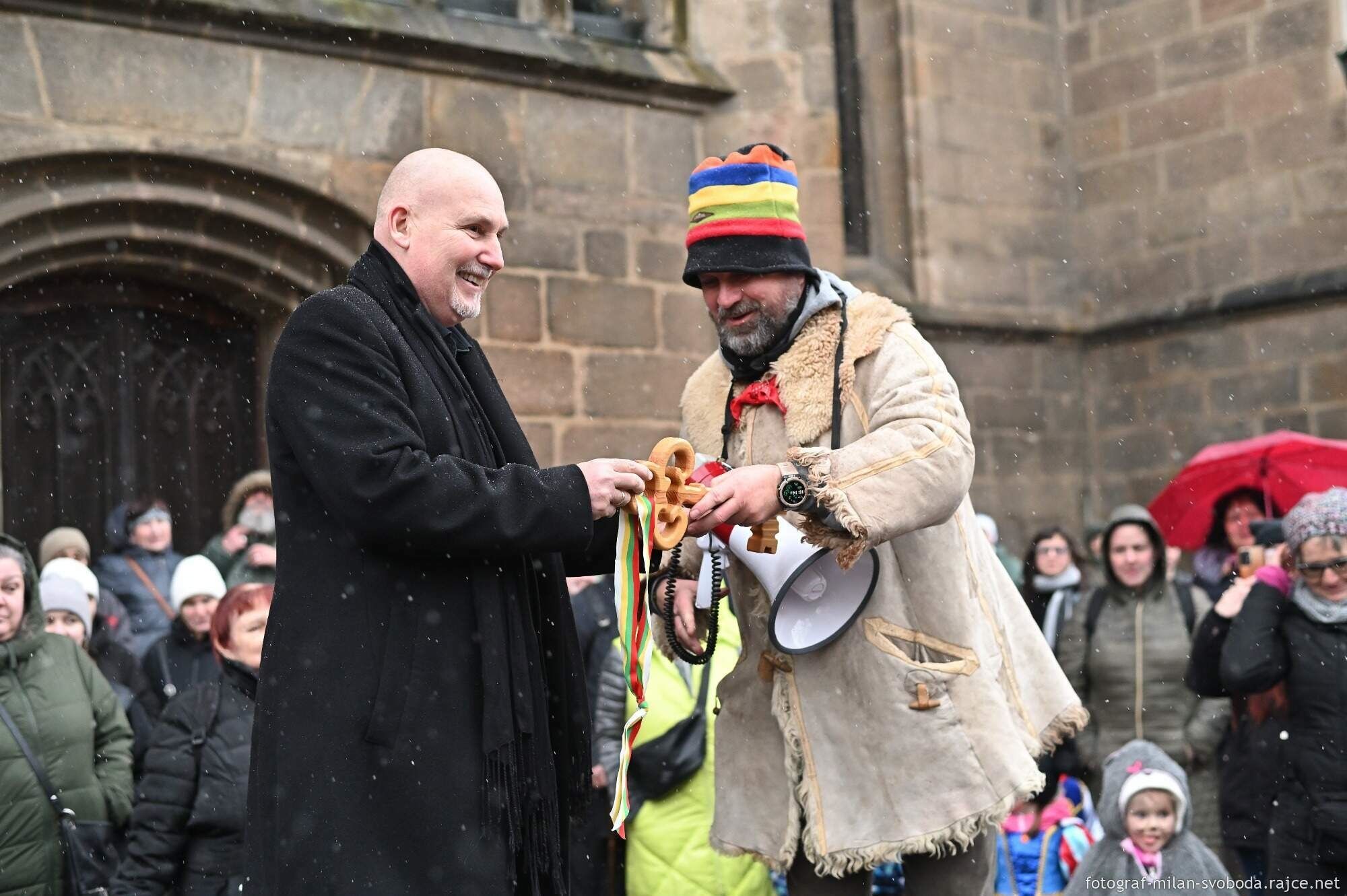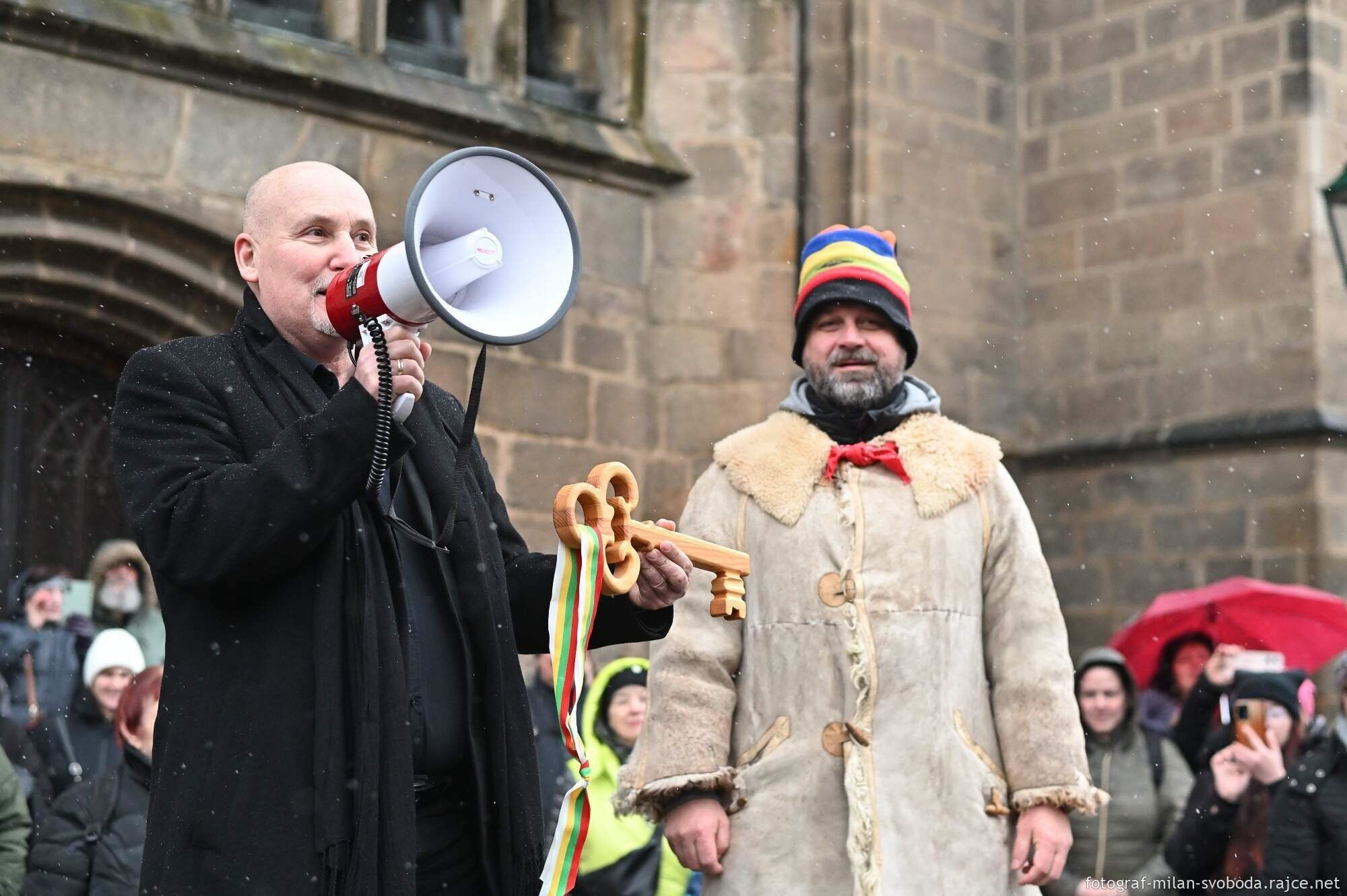 Předání pomysleného klíče, masopustní průvod, muzika, zpěv i tanec.. Plzeňské centrum ovládly masky.