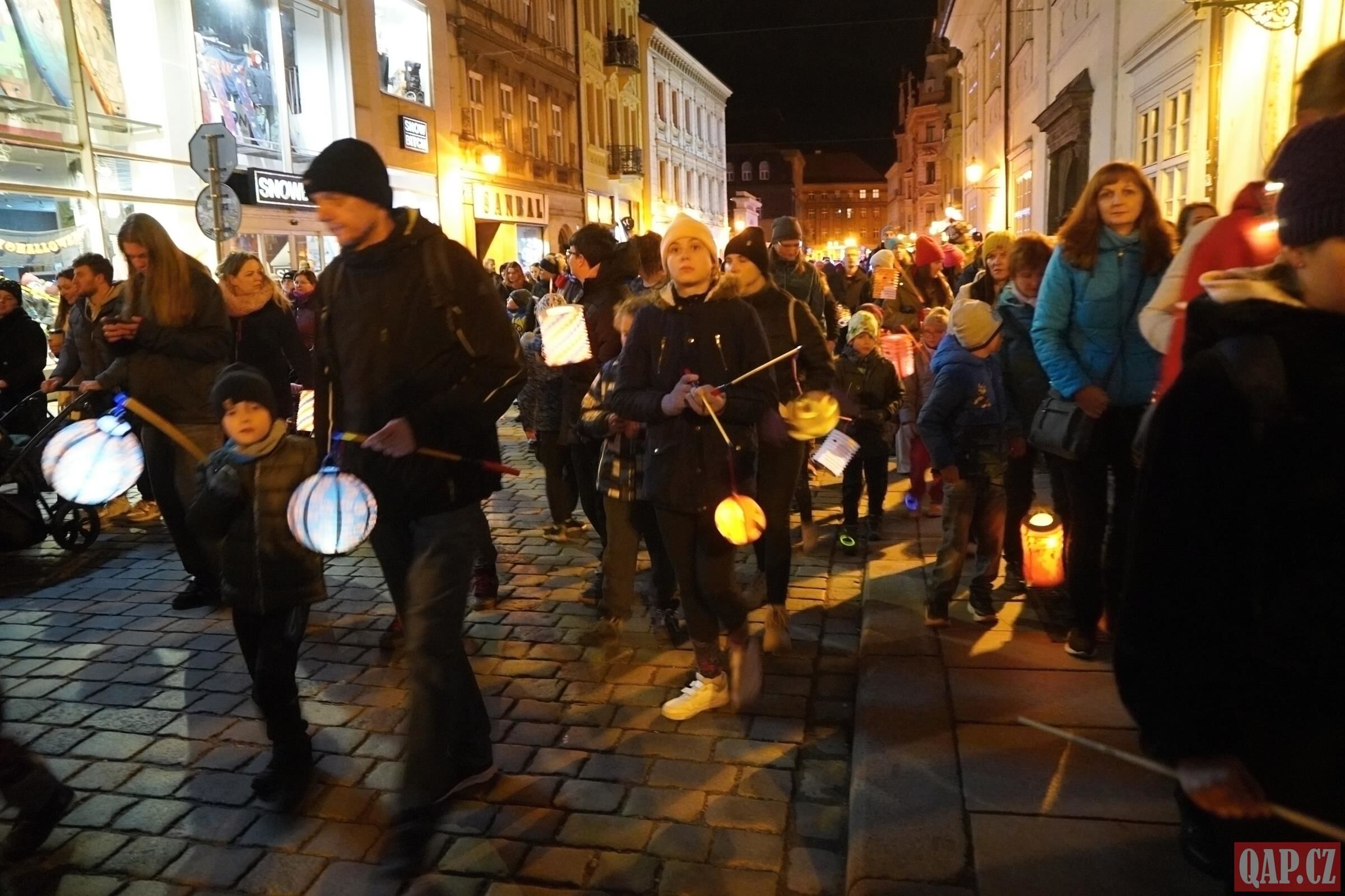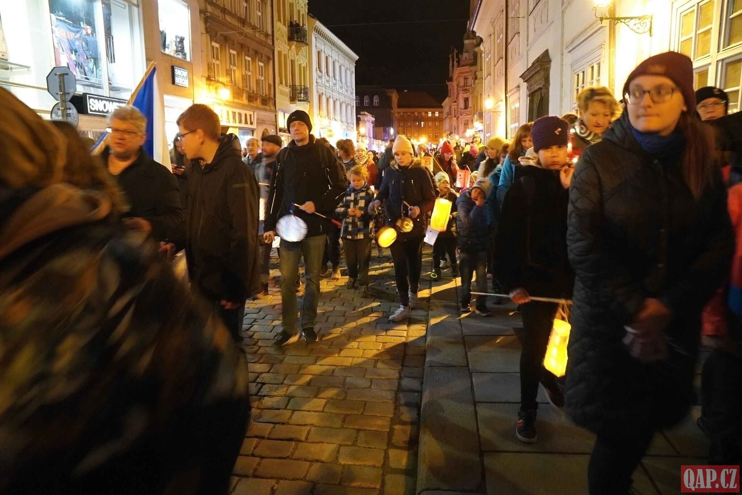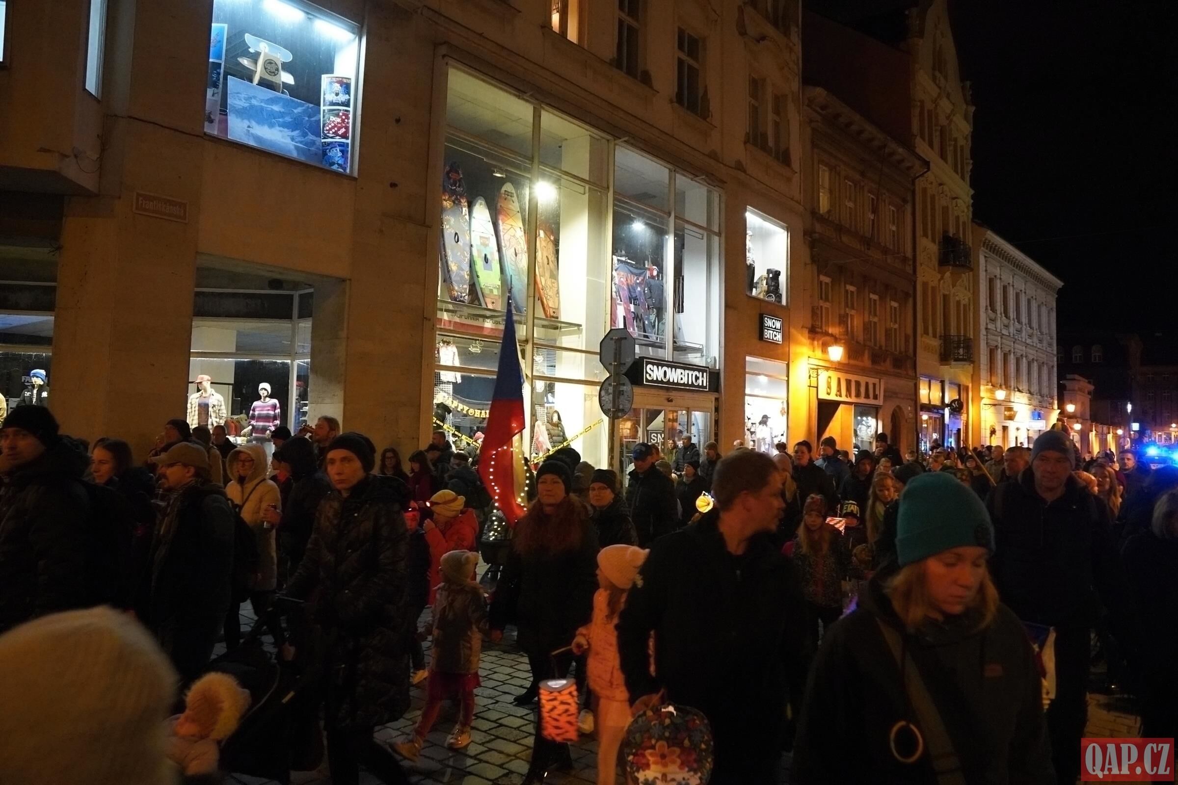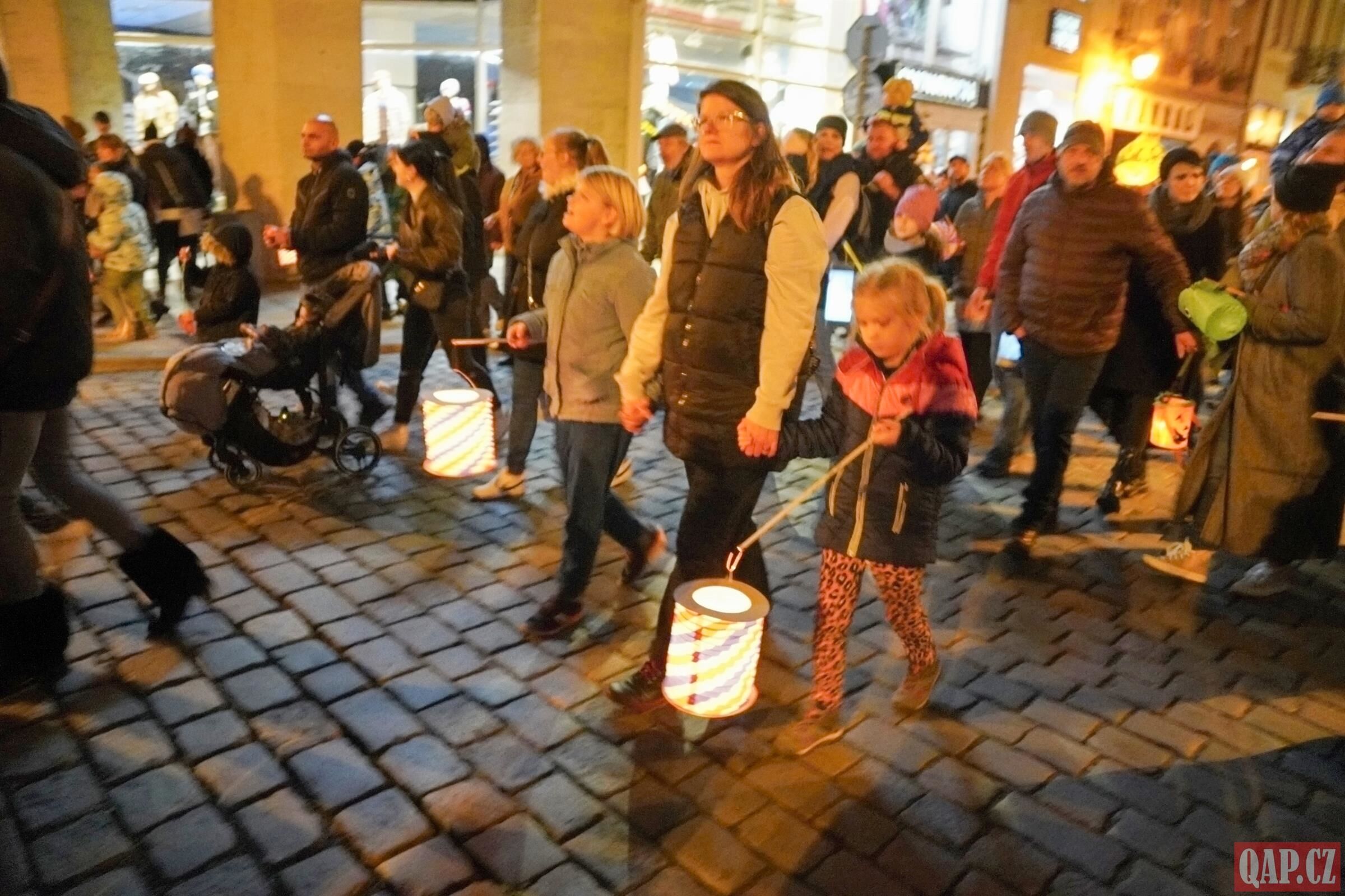 Závěr svátečního dne patřil tradičnímu lampionovému průvodu, který se vydal z náměstí T. G. Masaryka na náměstí Republiky. Původně plánovaný tichý ohňostroj muselo město kvůli silnému větru zrušit – bezpečnost tak dostala přednost. „Je to škoda, že to zrušili, nakonec není ani tak špatné počasí, ale chápeme to a těšíme se na příští rok,“ uvedla Jana z Litic, která šla v průvodu se svou rodinou.