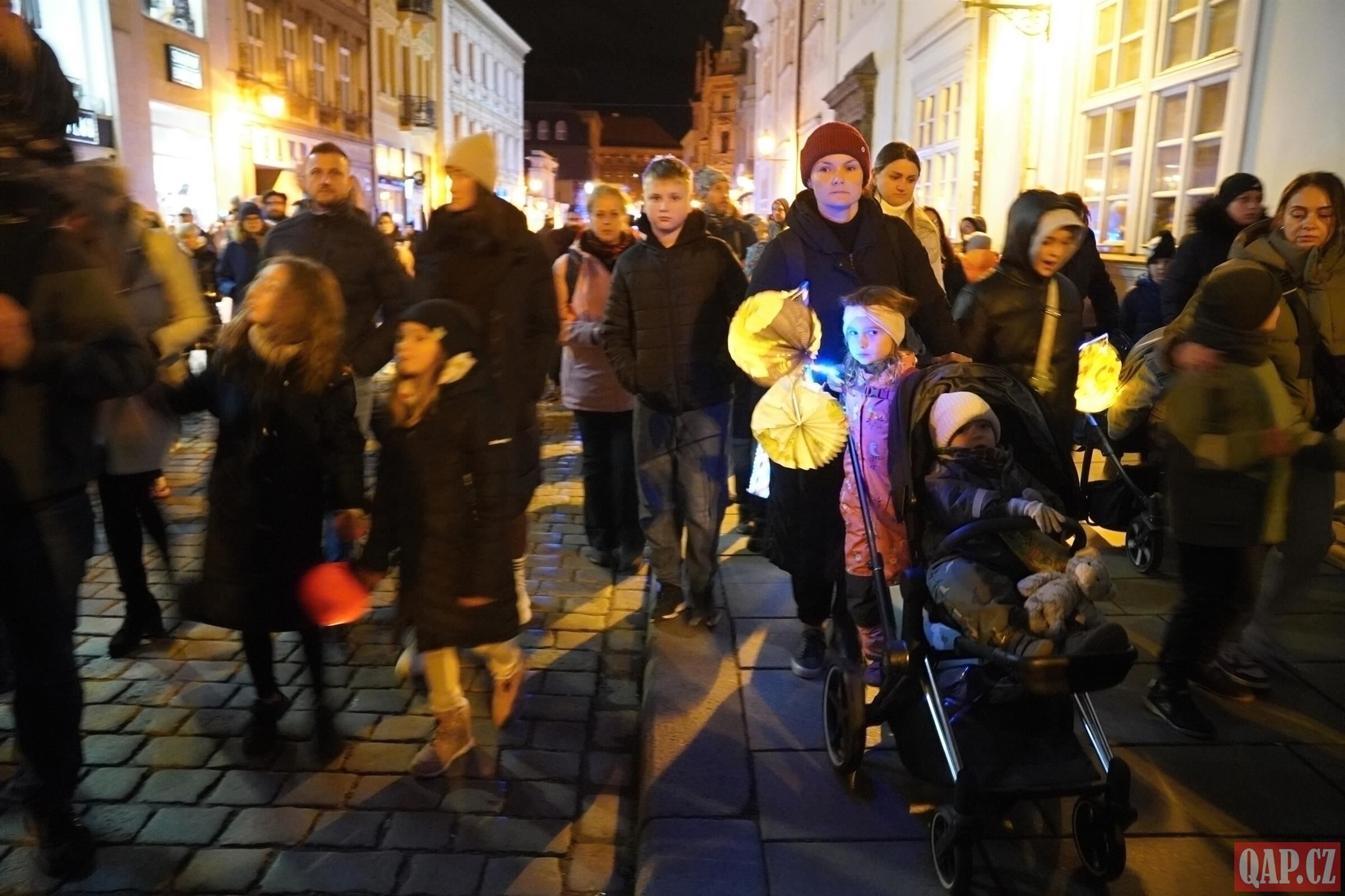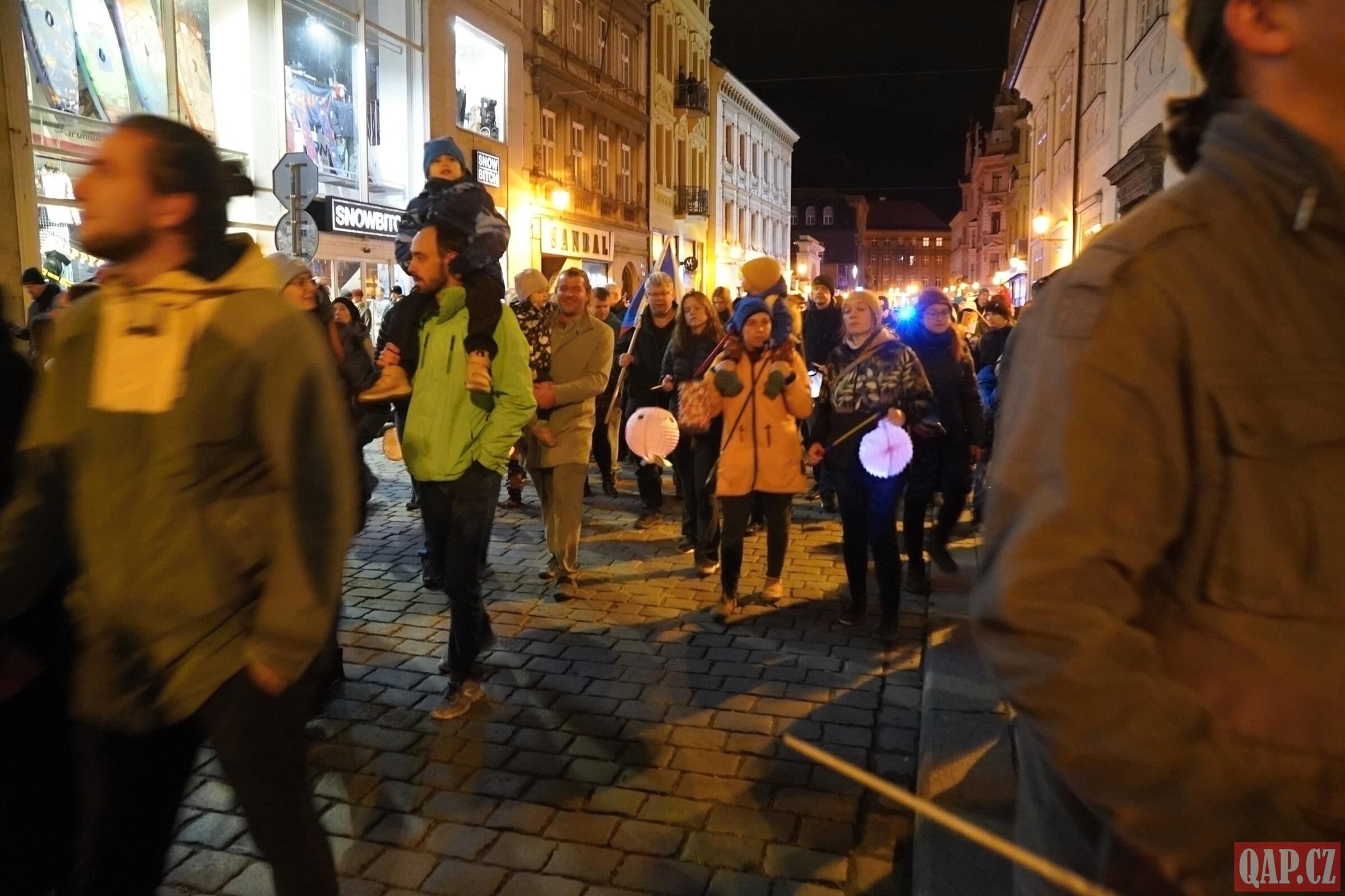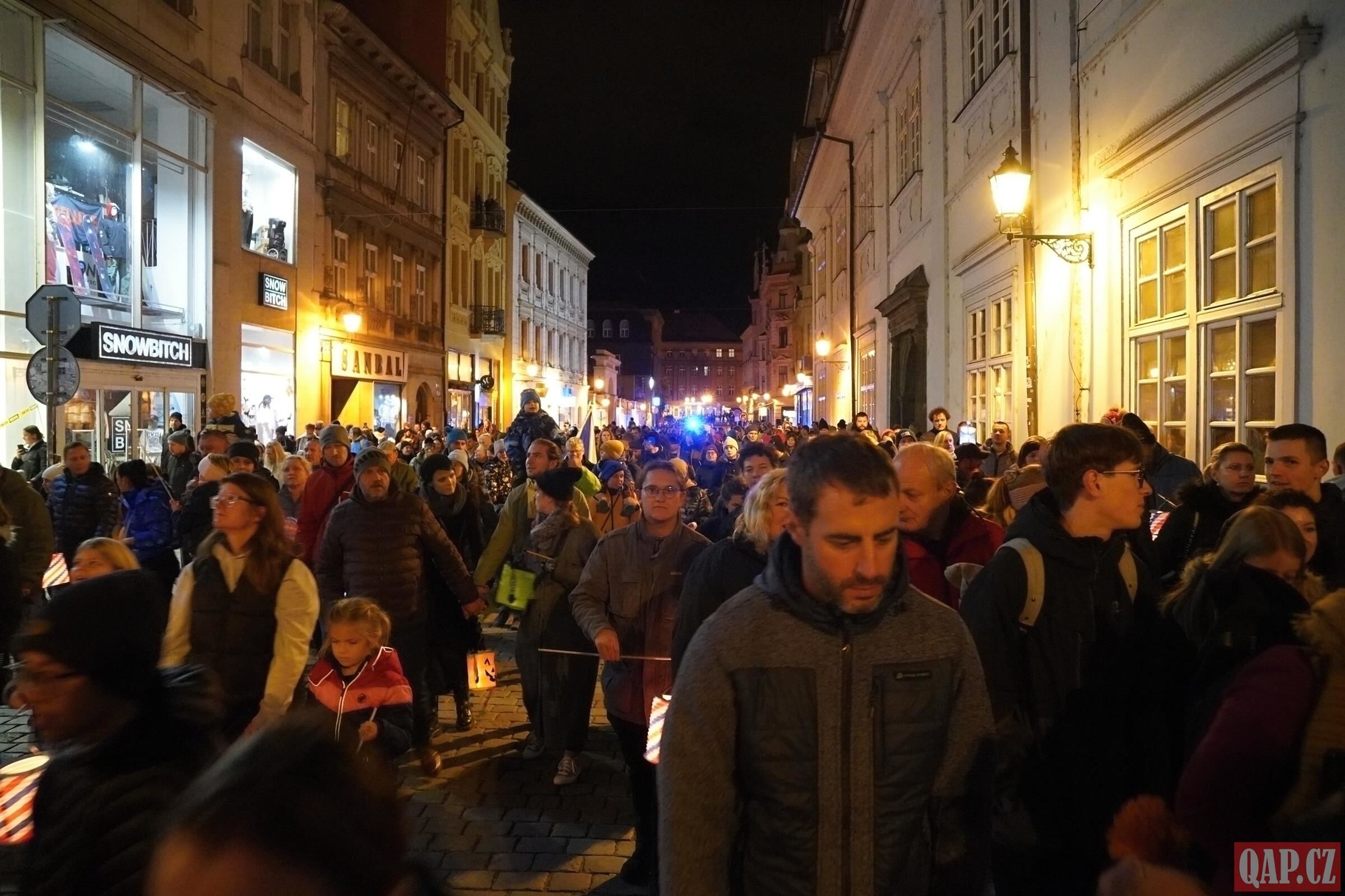 Závěr svátečního dne patřil tradičnímu lampionovému průvodu, který se vydal z náměstí T. G. Masaryka na náměstí Republiky. Původně plánovaný tichý ohňostroj muselo město kvůli silnému větru zrušit – bezpečnost tak dostala přednost. „Je to škoda, že to zrušili, nakonec není ani tak špatné počasí, ale chápeme to a těšíme se na příští rok,“ uvedla Jana z Litic, která šla v průvodu se svou rodinou.