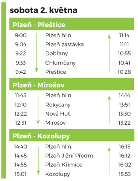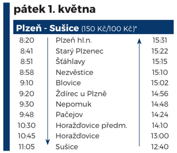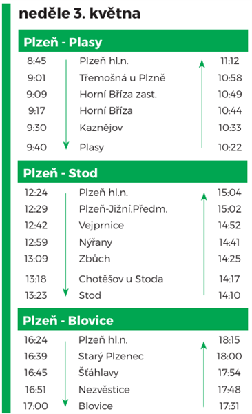 Vůni uhlí a historických vozů si budete moct užít v pátek 1. května na trase Plzeň – Horažďovice – Sušice, v sobotu 2. května se Šlechtična podívá z Plzně do Přeštic, přes Rokycany do Mirošova a do Kozolup a celý víkend v neděli 3. května zakončí historická souprava jízdami z Plzně do Plas, Stodu a Blovic.