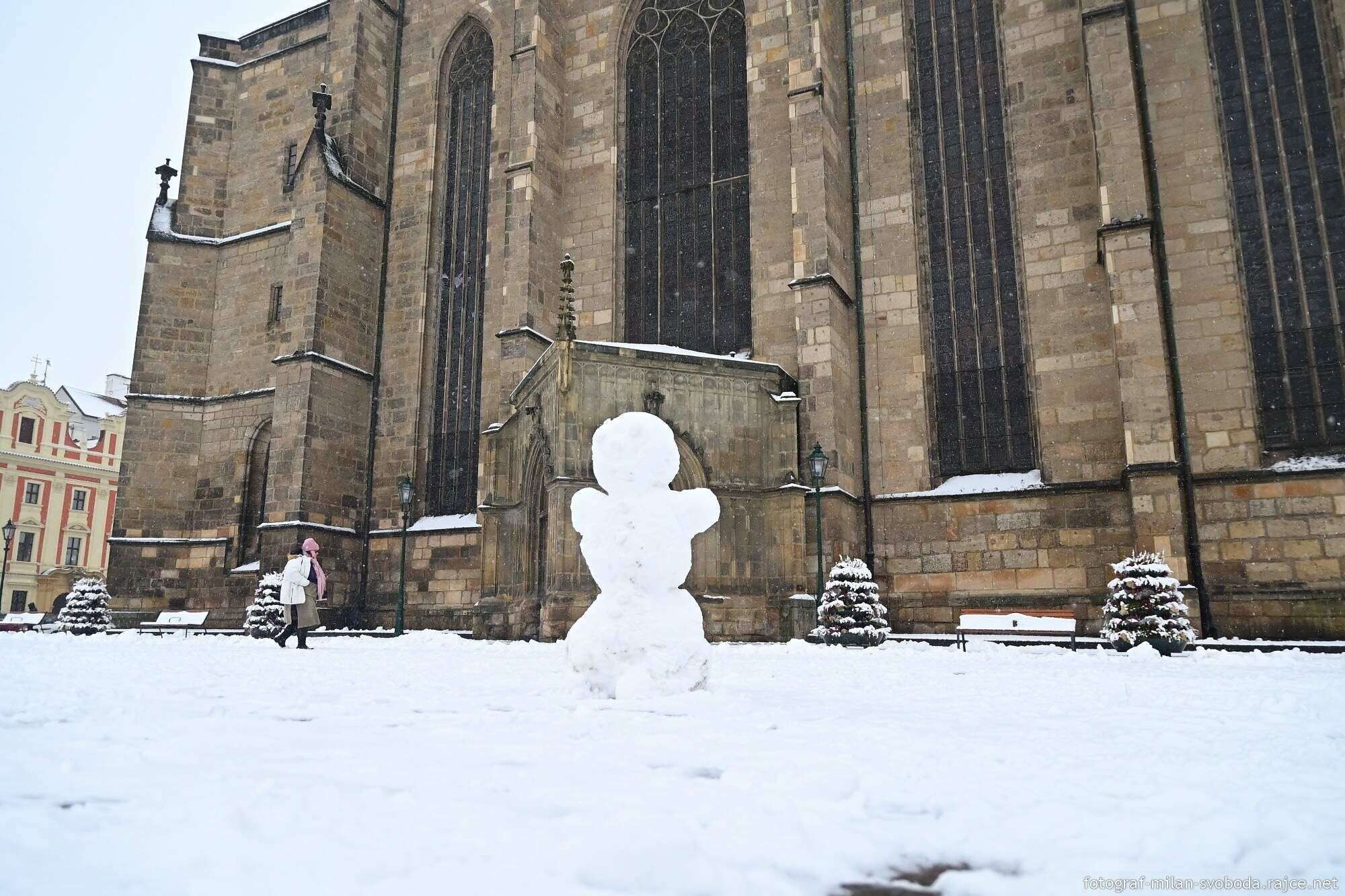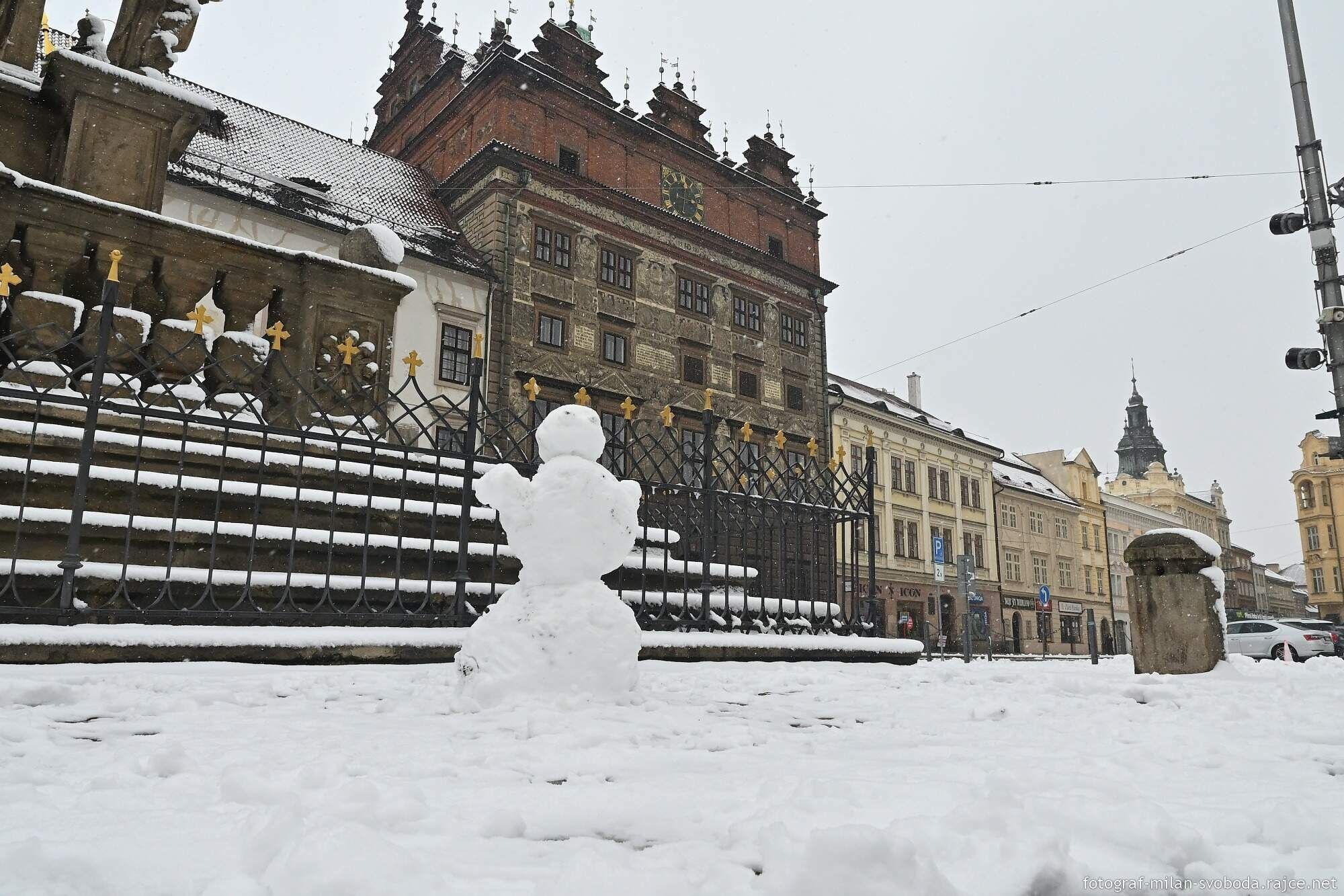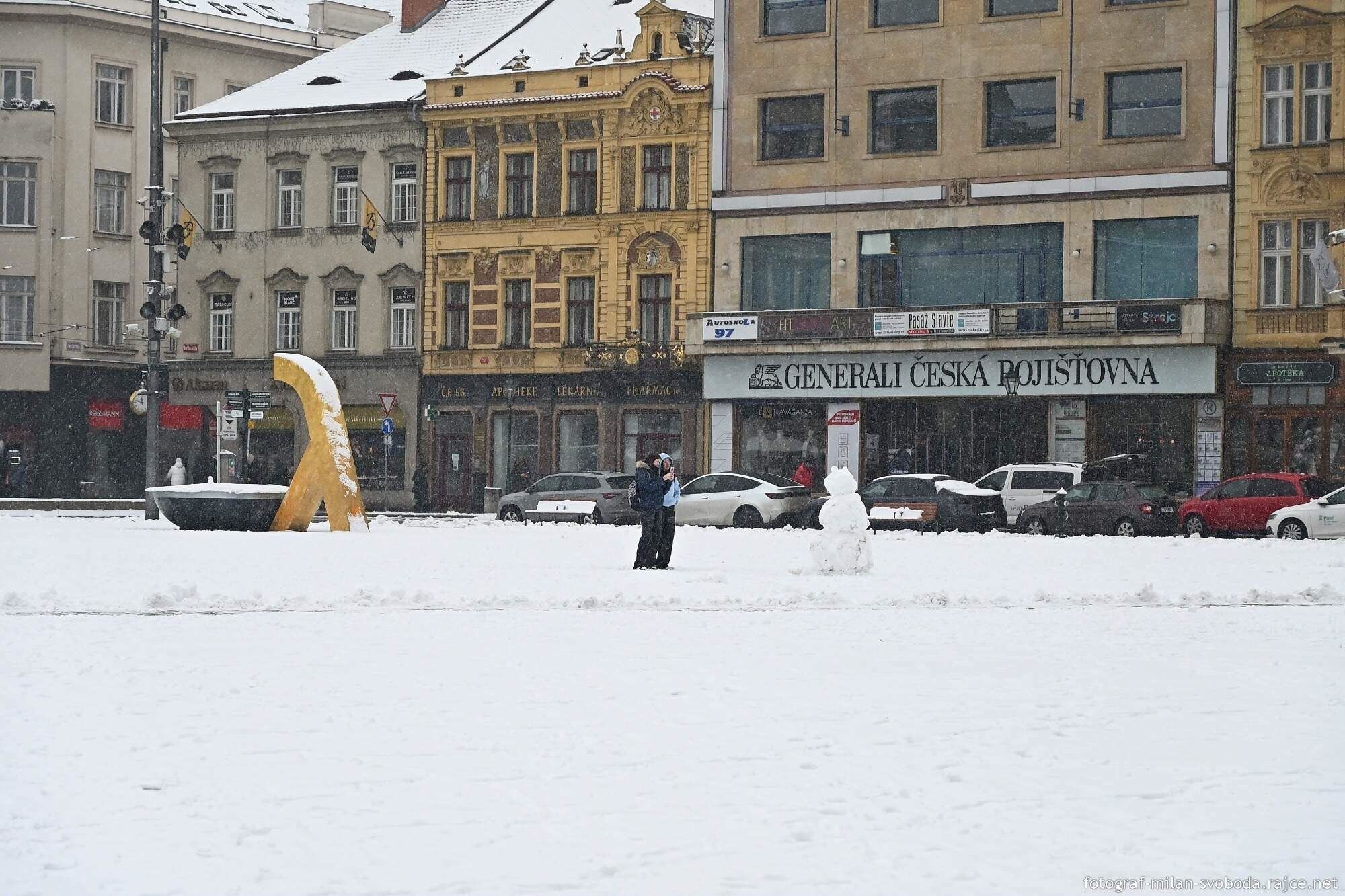 Jeho objektivu samozřejmě neunikla ani největší atrakce, která se objevila přímo v srdci města. Na náměstí Republiky totiž vyrostlo hned několik parádních sněhuláků.