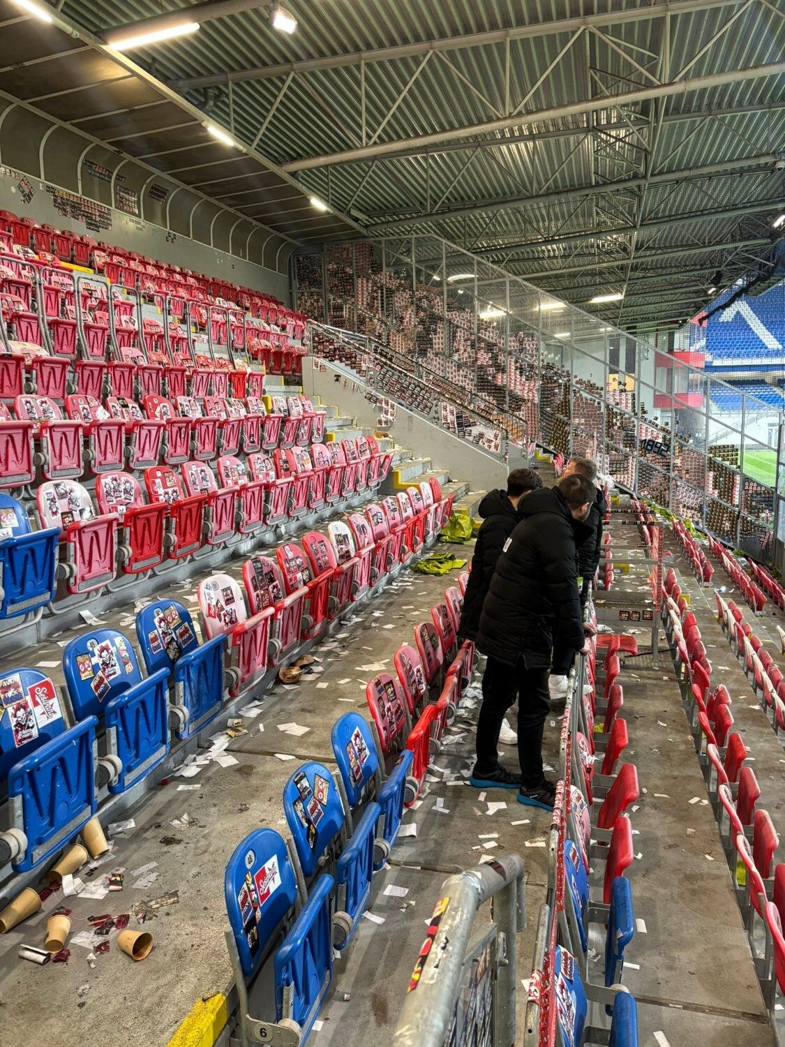 V sektoru hostů došlo navíc k výraznému poškození vybavení (vytržené sedačky, poškození sociálního zařízení či polepení plexiskel). Klub aktuálně sčítá škody, které se pohybují v řádech statisíců.