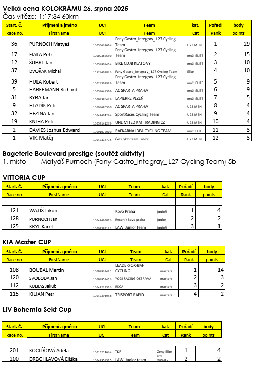 Aktivitou v bodovačkách a na prémiích hýřil Matyáš Purnoch, kterému zdatně pomáhala dvojice Petr Fiala a Robert Hula (všichni Fany Gastro_Integray_ L27 Cycling Team). V odjeté skupině byl s nimi právě Habermann a Davies Joshua Edward (RAFKARNA IDEA CYCLING TEAM). Ale ani tato skupina nevydržela před pelotonem kroužit více jak sedm okruhů.