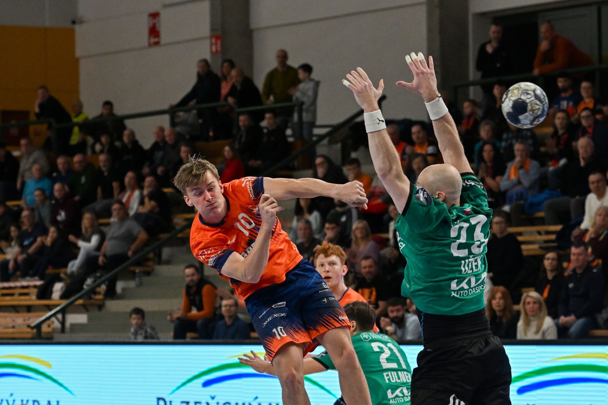 Talent vstoupil do zápasu aktivně a v průběhu prvního poločasu si dokázal vypracovat až čtyřbrankový náskok. Karviná ale náskok postupně snižovala a ke konci první části stáhla manko na 15:15. Závěr poločasu ale patřil opět Plzni, která si vzala vedení zpět.