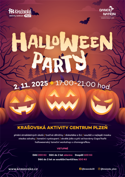 Už v neděli 2. listopadu od 17 do 21 hodin se Krašovská promění v temné, ale veselé strašidelné království. Na Halloween party, kterou pořádá Taneční škola Dance Nation a Krašovská Aktivity centrum Plzeň, čeká návštěvníky spousta zábavy – od dětské diskotéky se světelnými efekty, přes soutěže o ceny, malování na obličej zdarma až po stezku odvahy pro ty nejodvážnější.