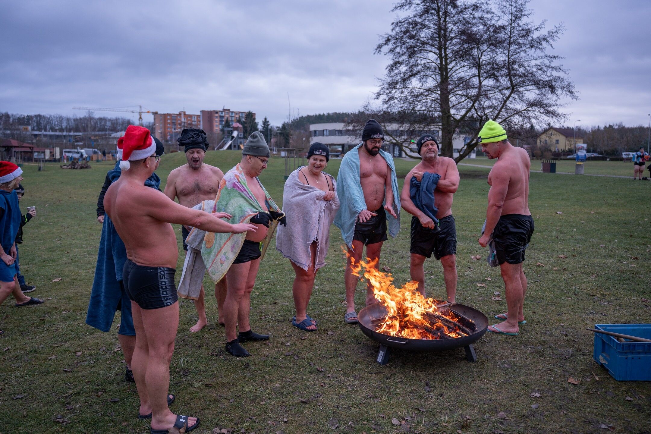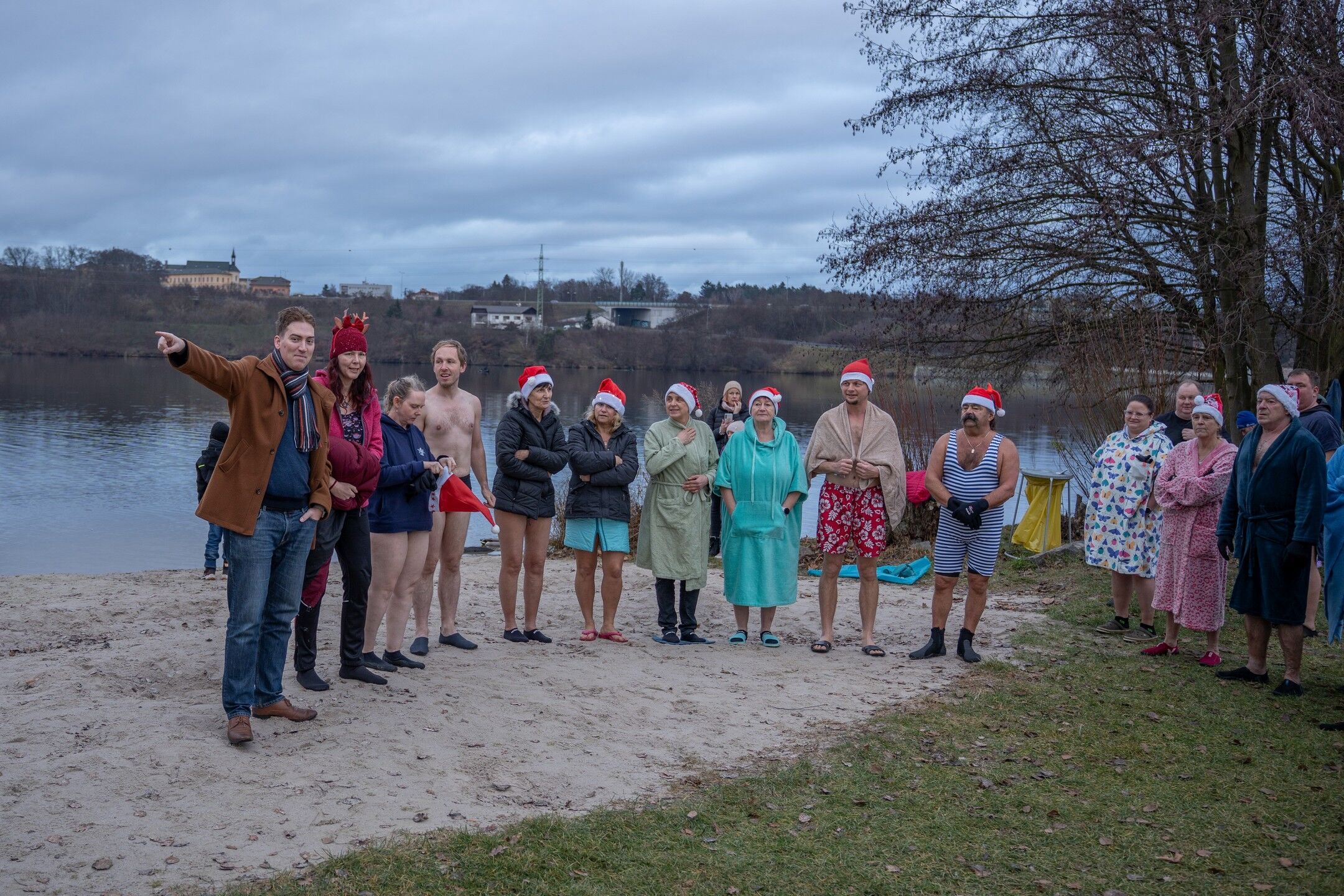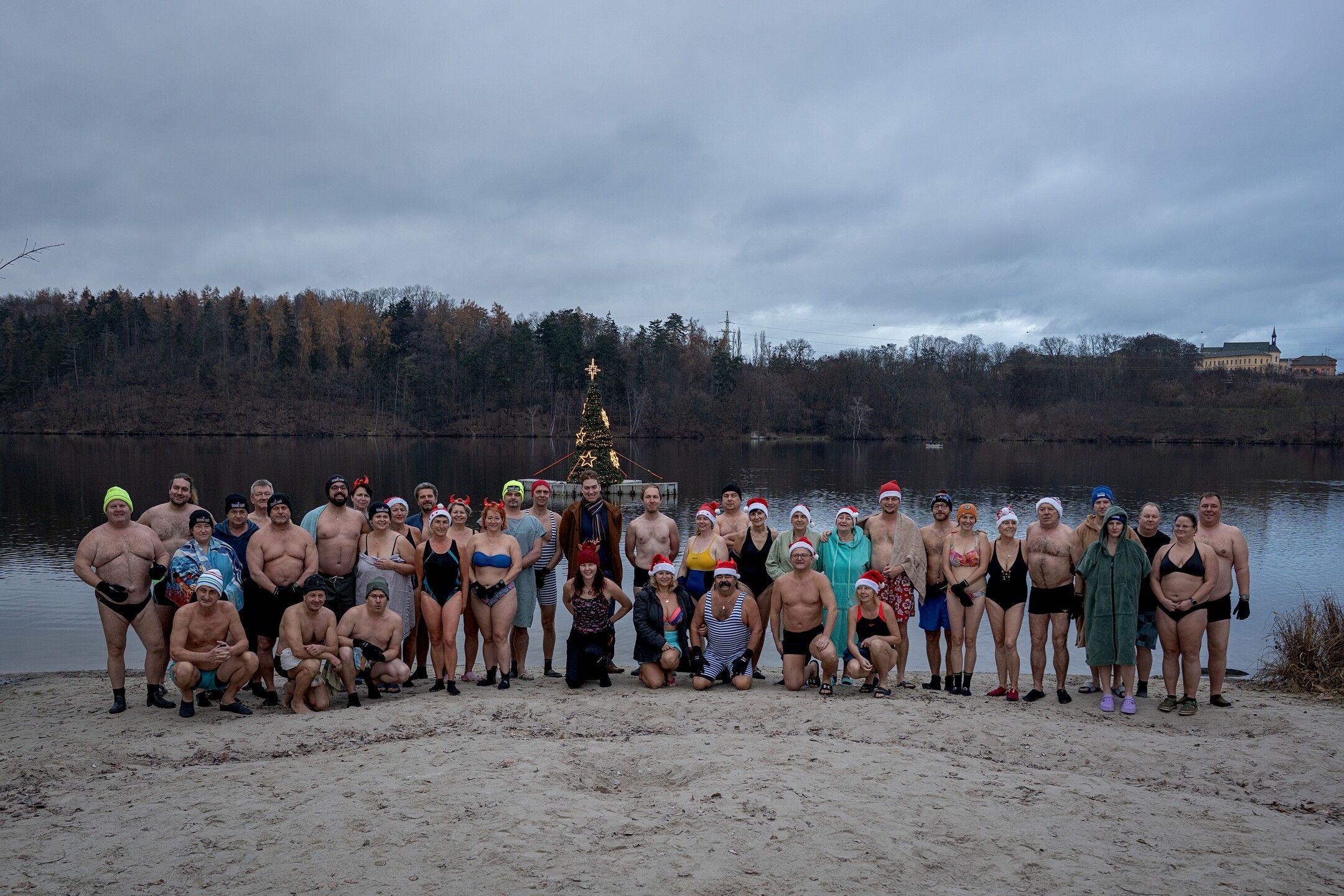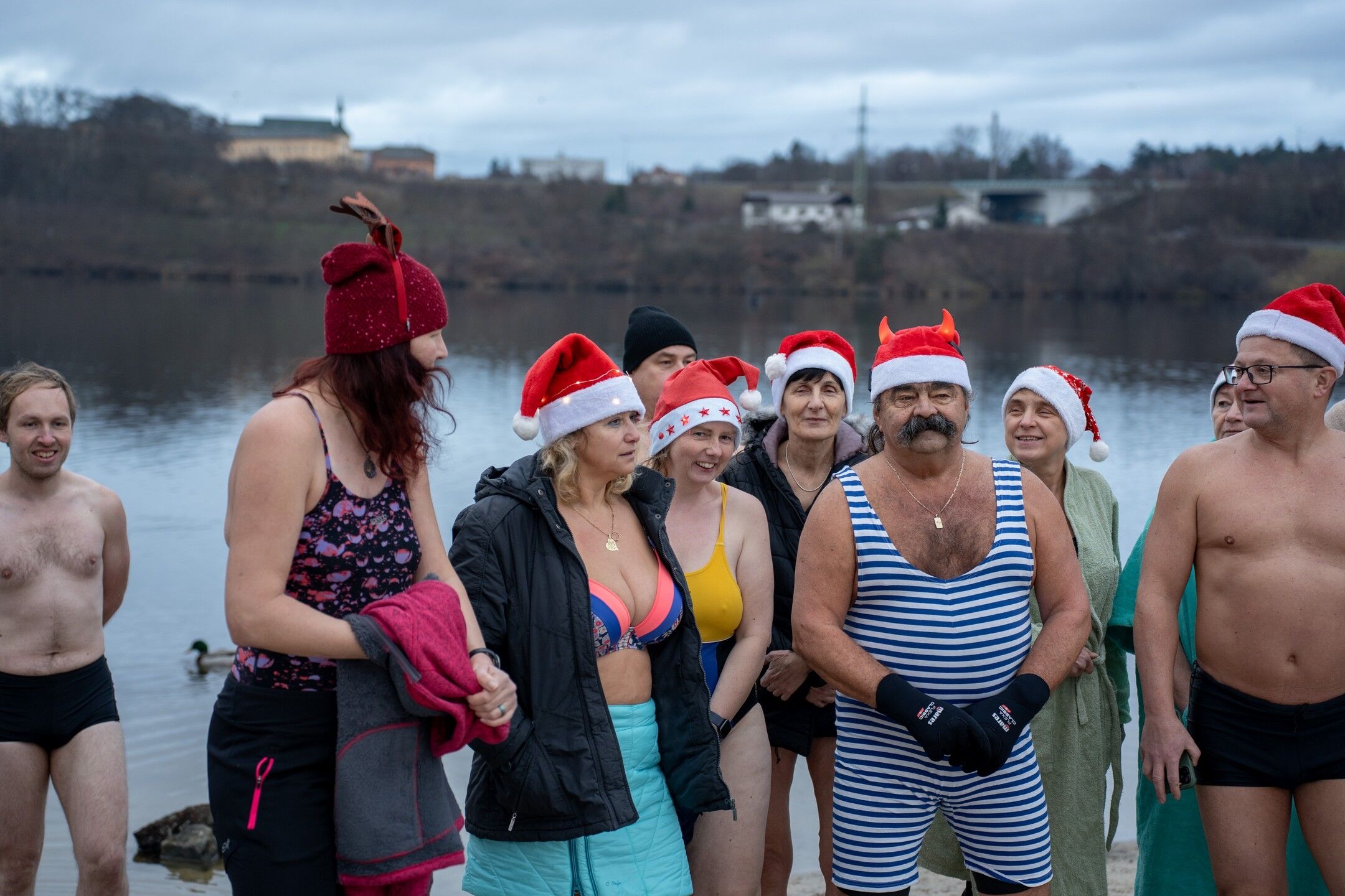 Krátce po 15. hodině se do studené vody Borské přehrady ponořila zhruba čtyřicítka nadšenců, která si v ledovém počasí užila nejen koupání, ale i společnou adventní atmosféru.