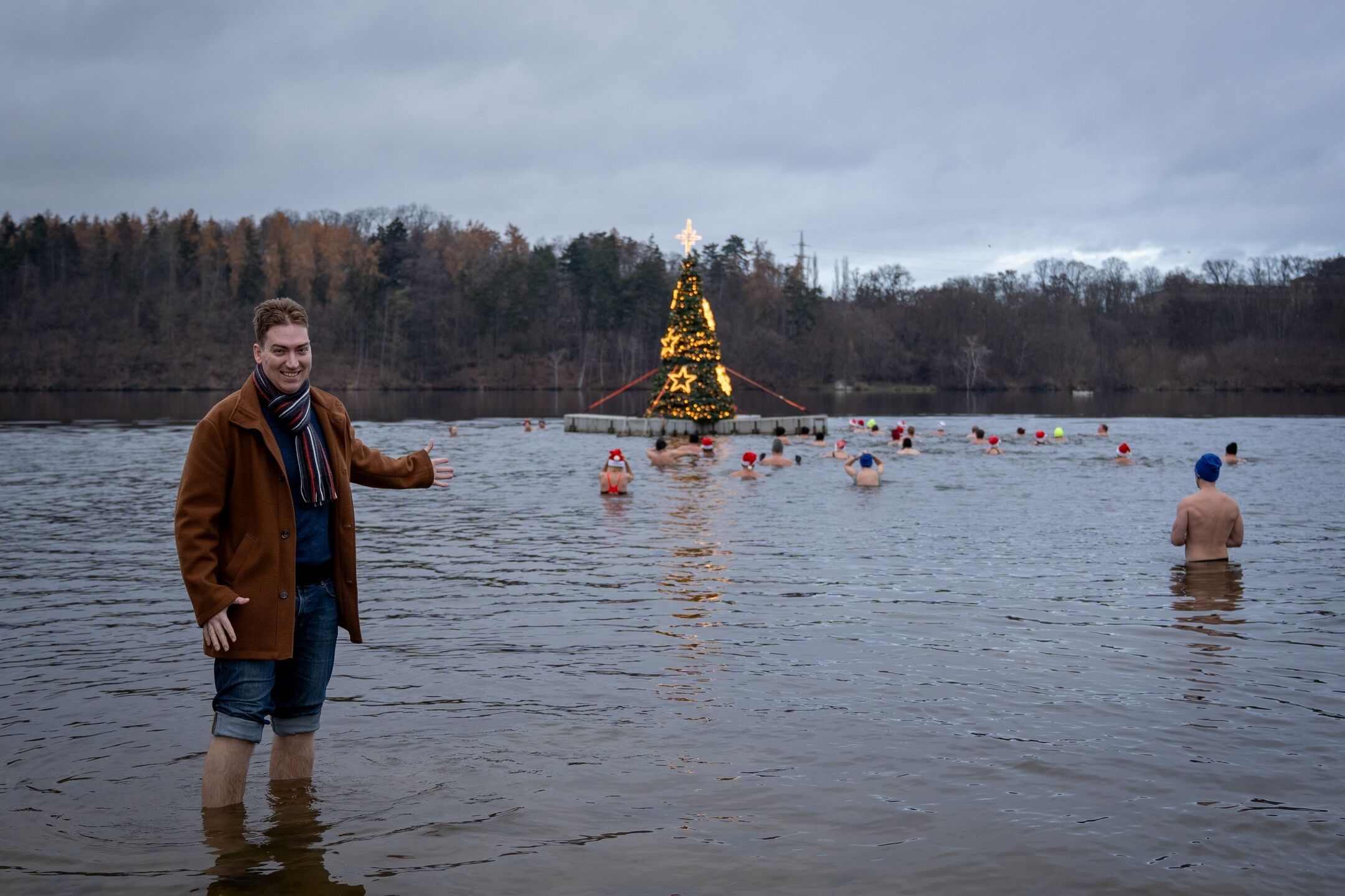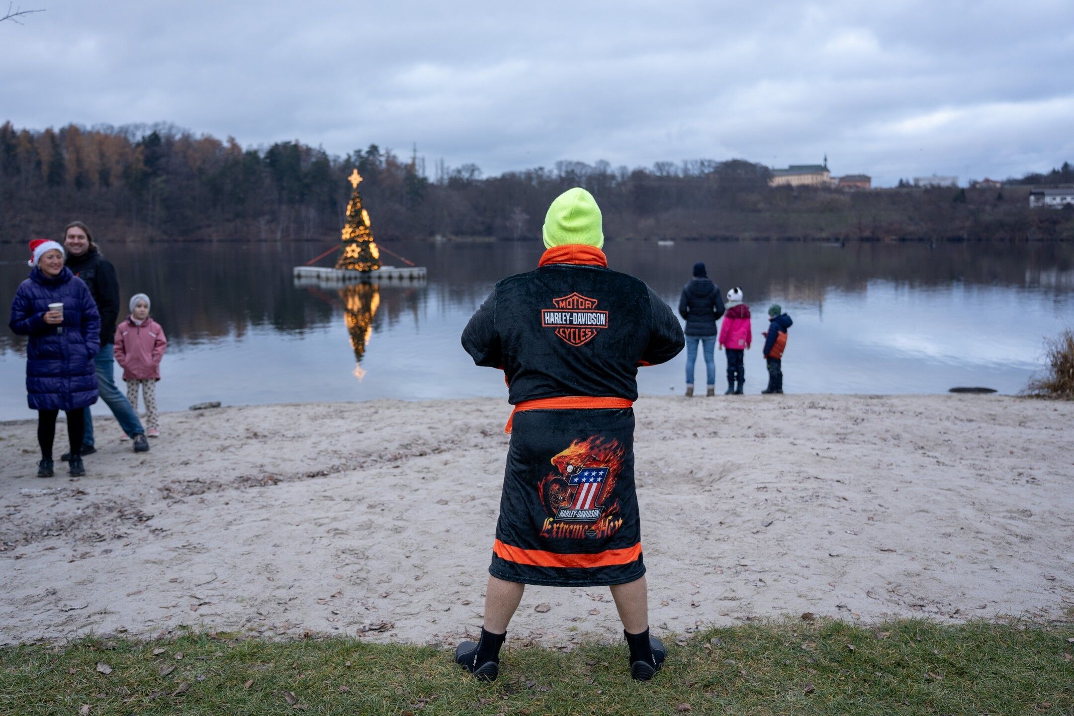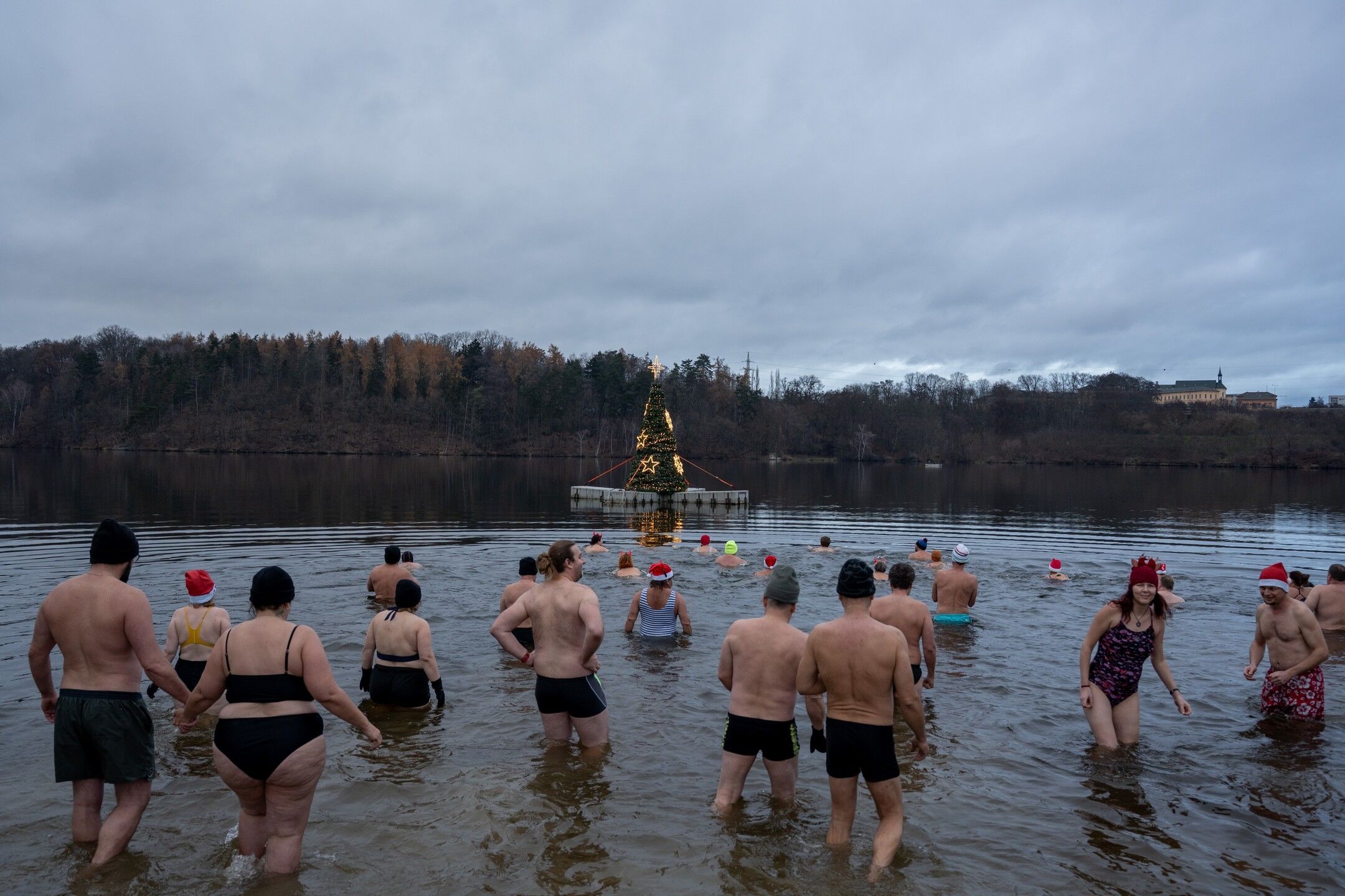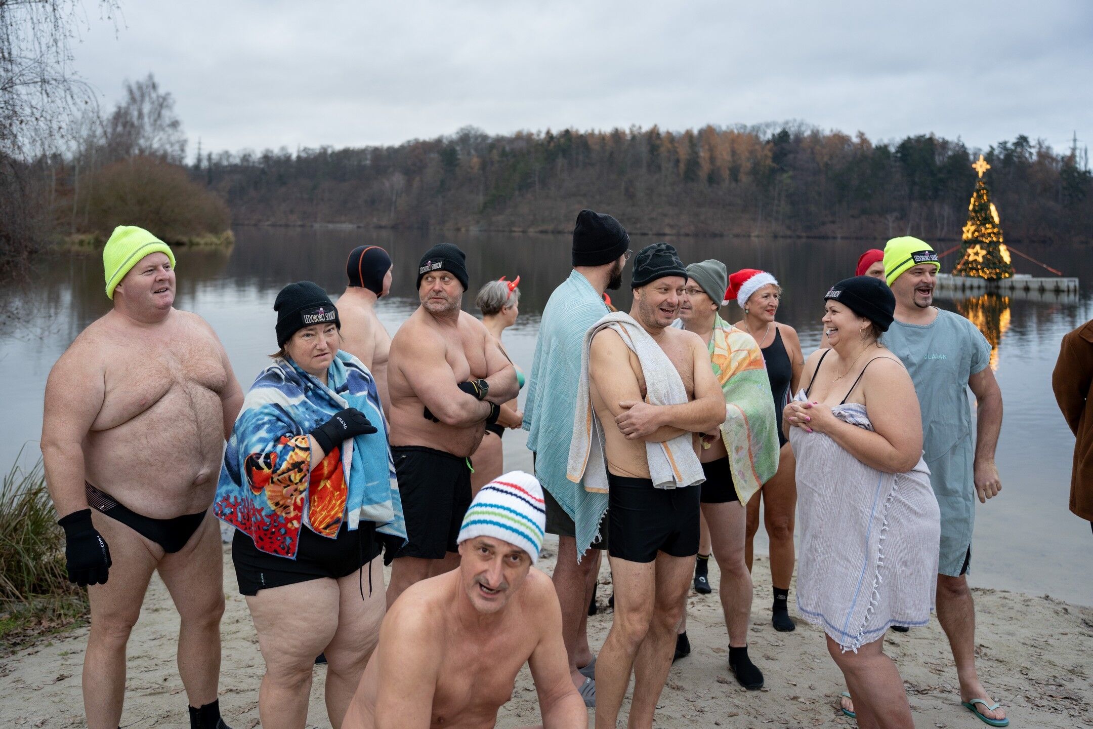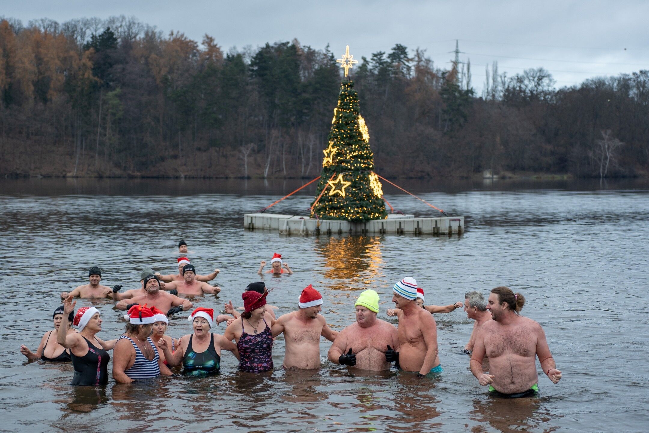 Krátce po 15. hodině se do studené vody Borské přehrady ponořila zhruba čtyřicítka nadšenců, která si v ledovém počasí užila nejen koupání, ale i společnou adventní atmosféru.