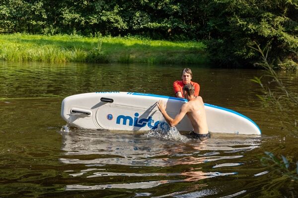 Foto z nácviku záchrany tonoucího pomocí paddleboardu na dětském táboře, který pořádal Český červený kříž Plzeň.