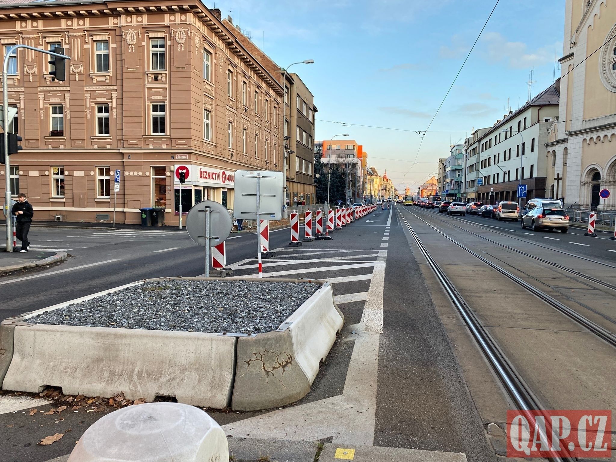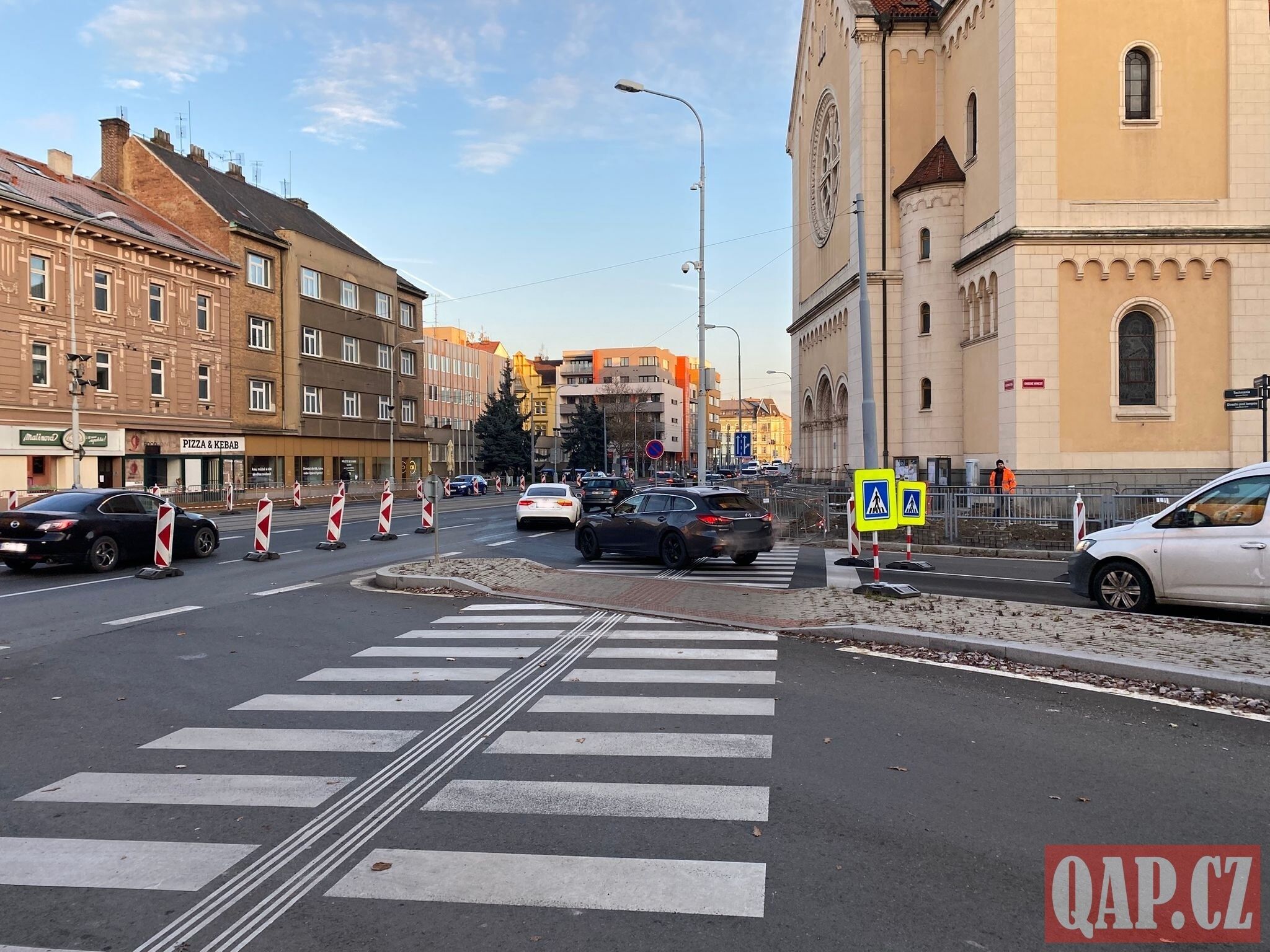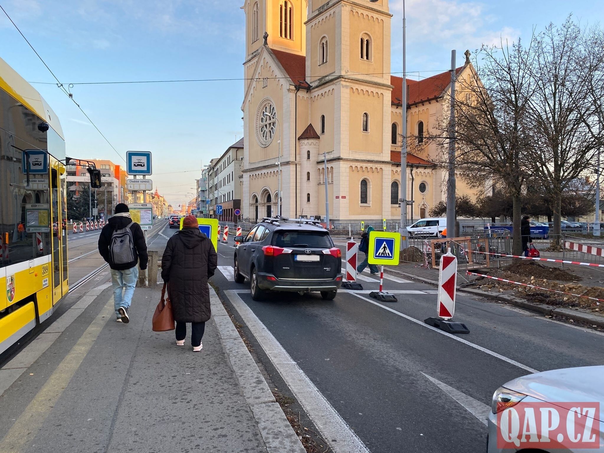 Pro vozidla přijíždějící ve směru do centra je v místě přechodu u tramvajových zastávek zúžen provoz do jednoho pruhu, aby byla zajištěna větší bezpečnost chodců.
