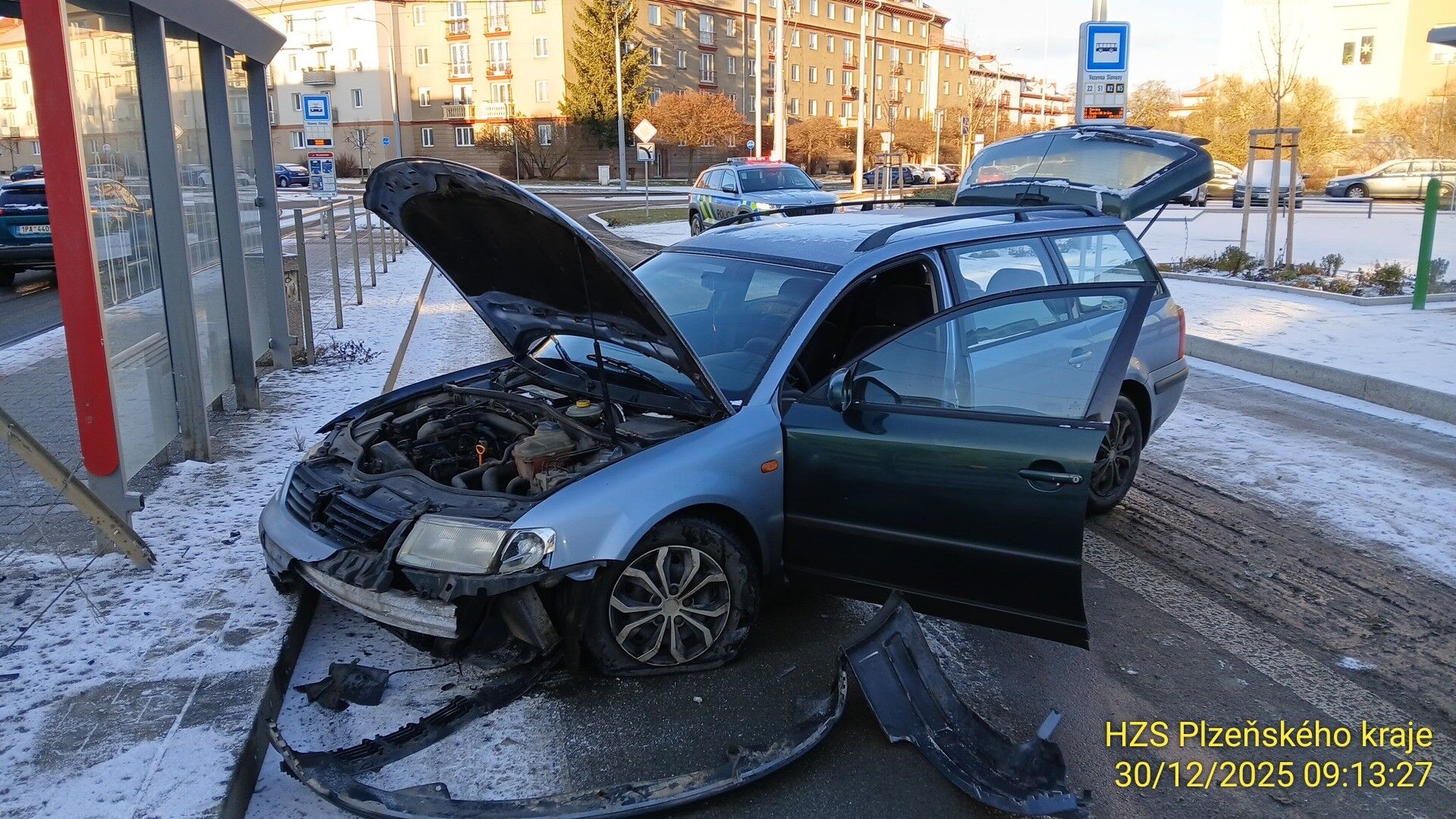 Dopravní nehodu evidují plzeňští dopravní policisté. „Dne 30. prosince 2025 v 09:00 hodin jel v Plzni po vozovce ulice Slovanská alej ve směru od ulice Skladová k ulici Francouzská devatenáctiletý řidič s vozidlem tovární značky Volkswagen Passat. V prostoru mírné pravotočivé zatáčky v prostoru tramvajové zastávky MHD Vozovna Slovany zřejmě nepřizpůsobil rychlost jízdy svého vozidla povětrnostním podmínkám (námraza) a svým schopnostem. S vozidlem se dostal do neřízeného smyku vlevo, najel předními koly na vyvýšený obrubník a přední částí vozidla se střetl se zábradlím a zastřešením zastávky," popsala nehodu mluvčí policie Dagmar Mifková.