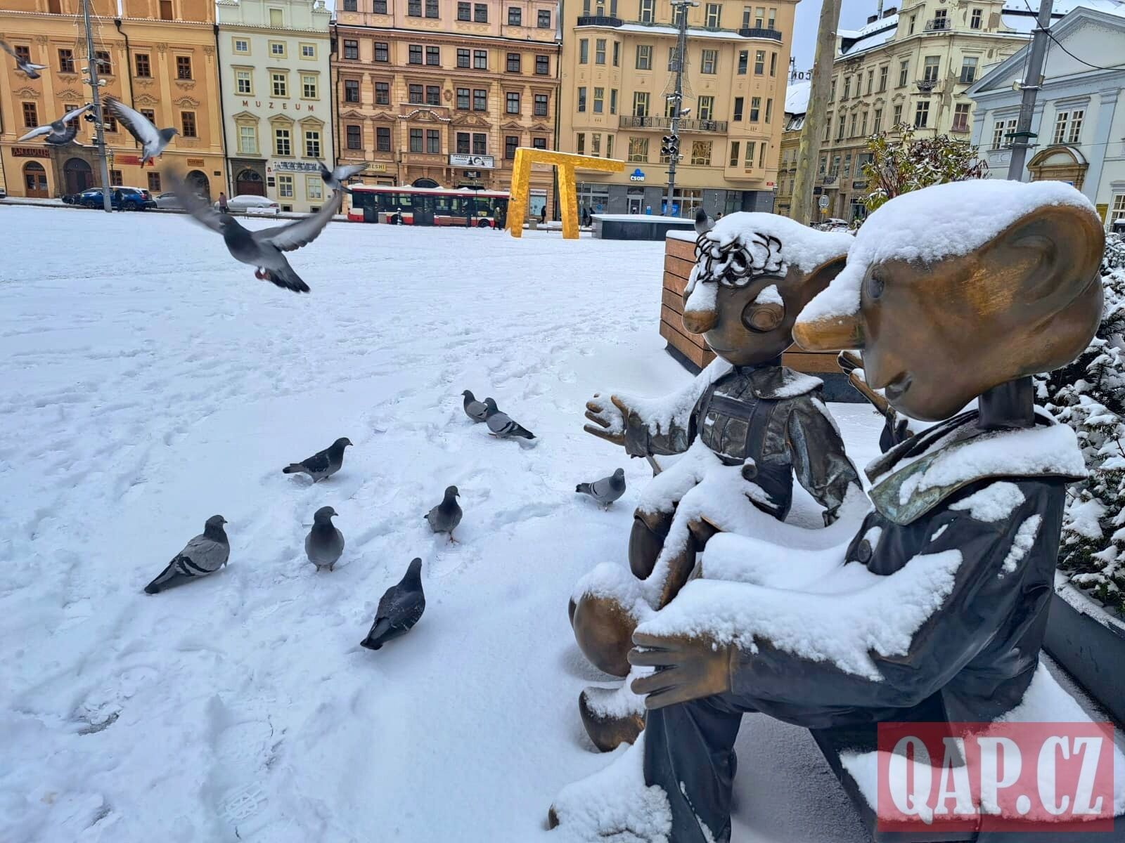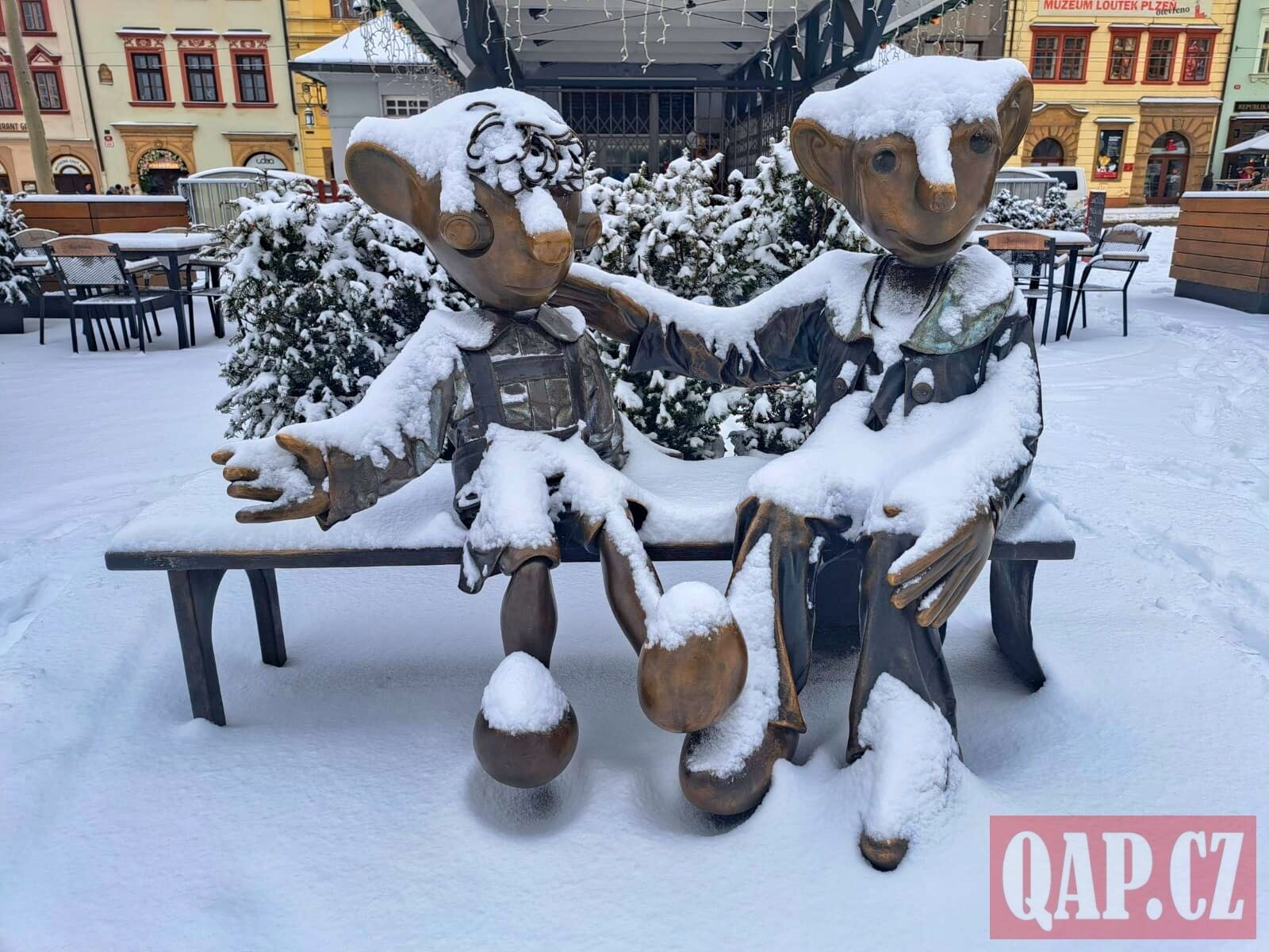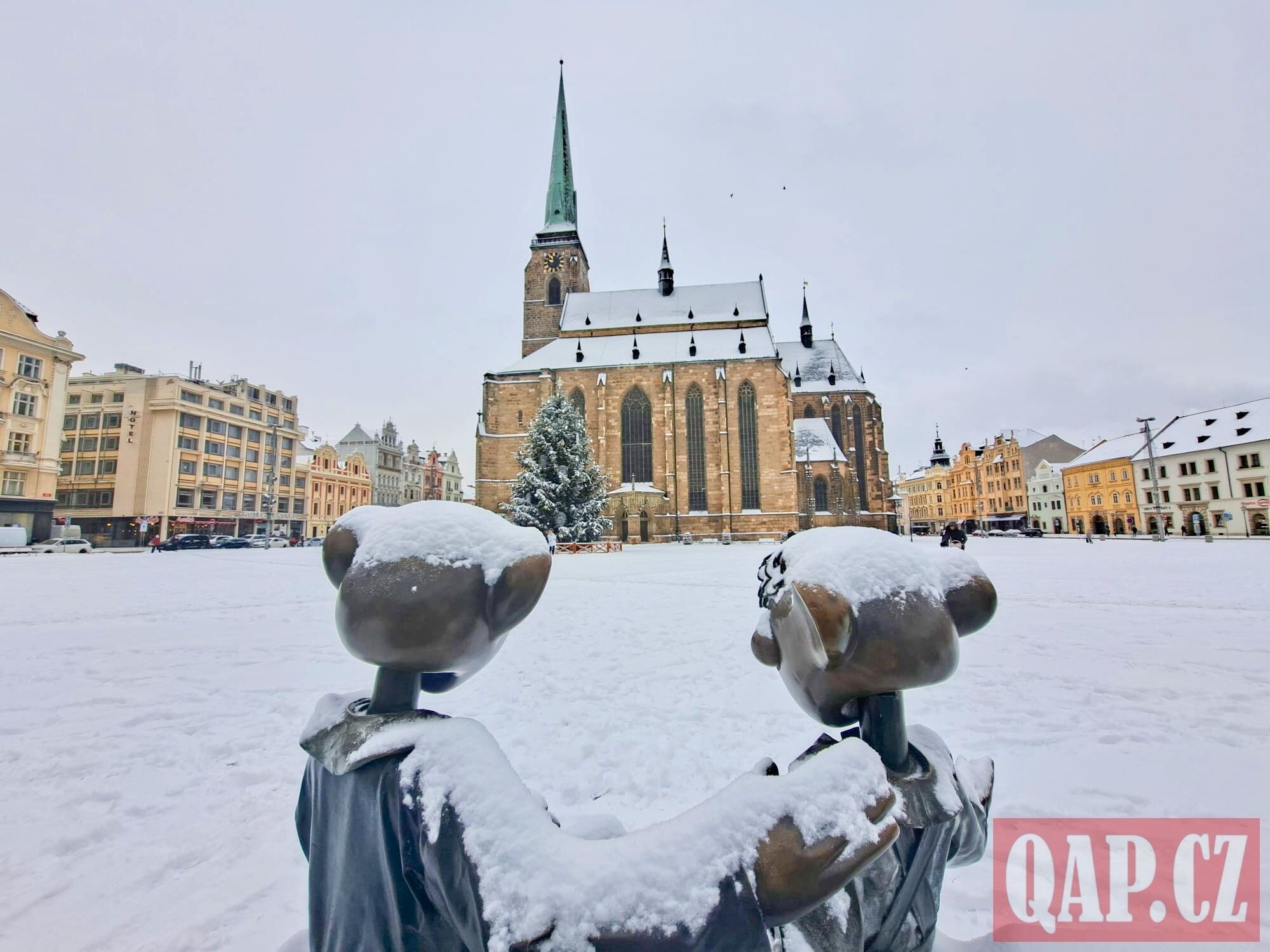 Zasněžené náměstí Republiky s přilehlými ulicemi a parky v centru nabízí neobvyklý pohled. Sníh pokrývá i fontány u katedrály sv. Bartoloměje a sochu ikonické dvojice, Spejbla a Hurvínka.