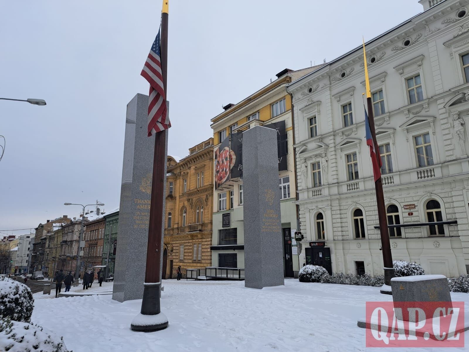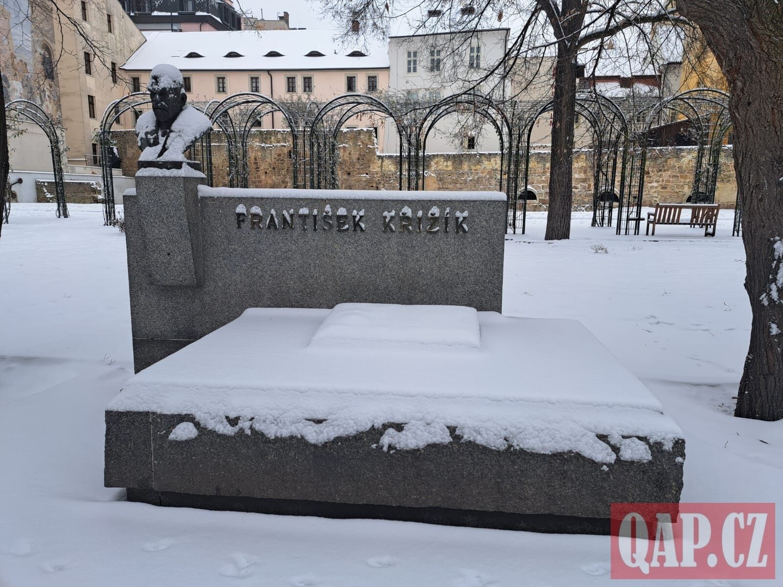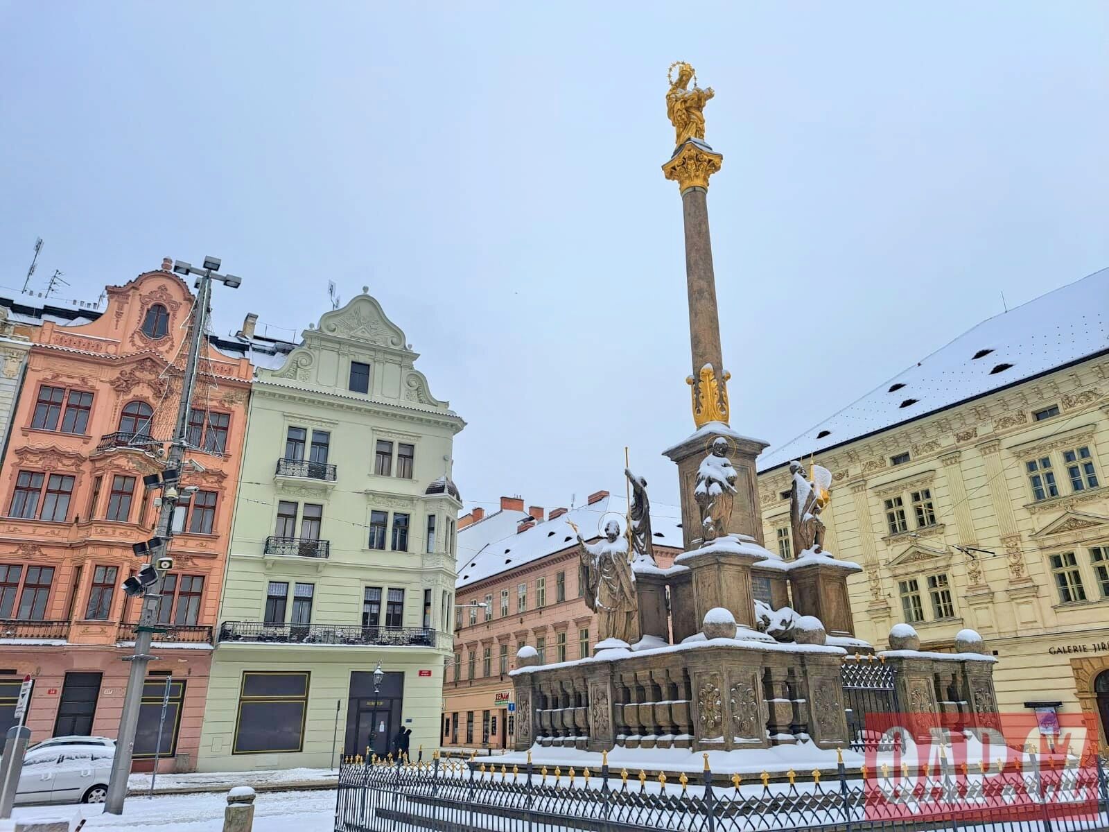 Zasněžené náměstí Republiky s přilehlými ulicemi a parky v centru nabízí neobvyklý pohled. Sníh pokrývá i fontány u katedrály sv. Bartoloměje a sochu ikonické dvojice, Spejbla a Hurvínka.