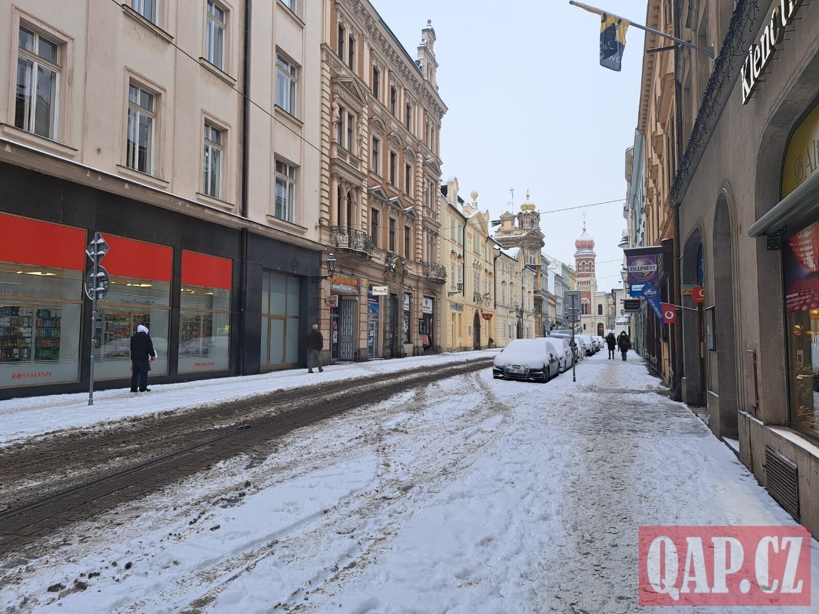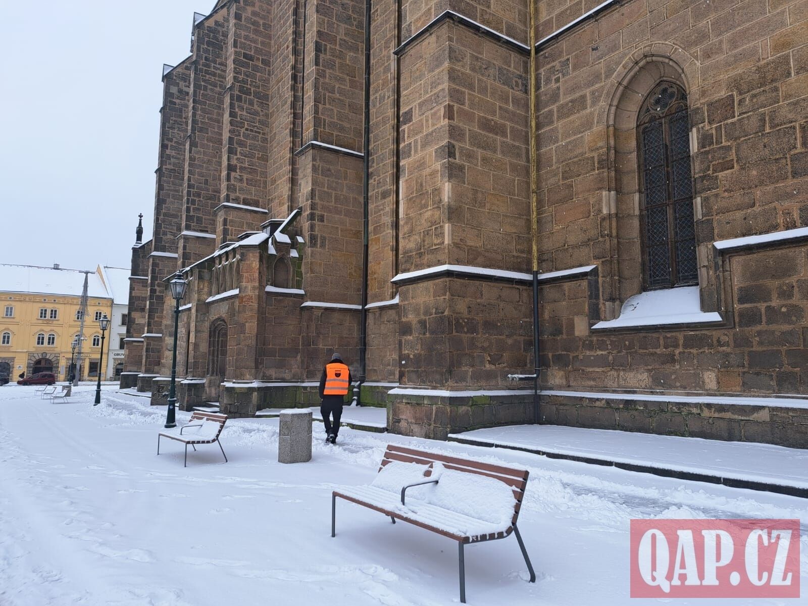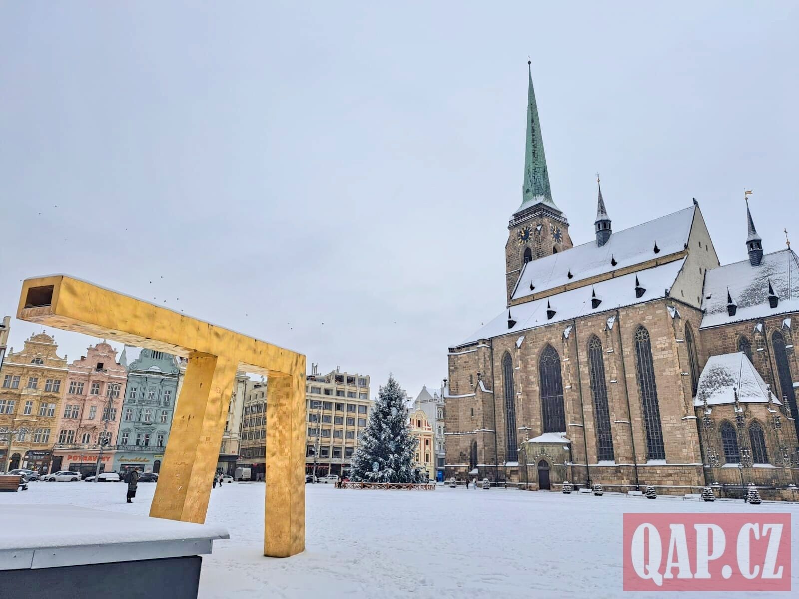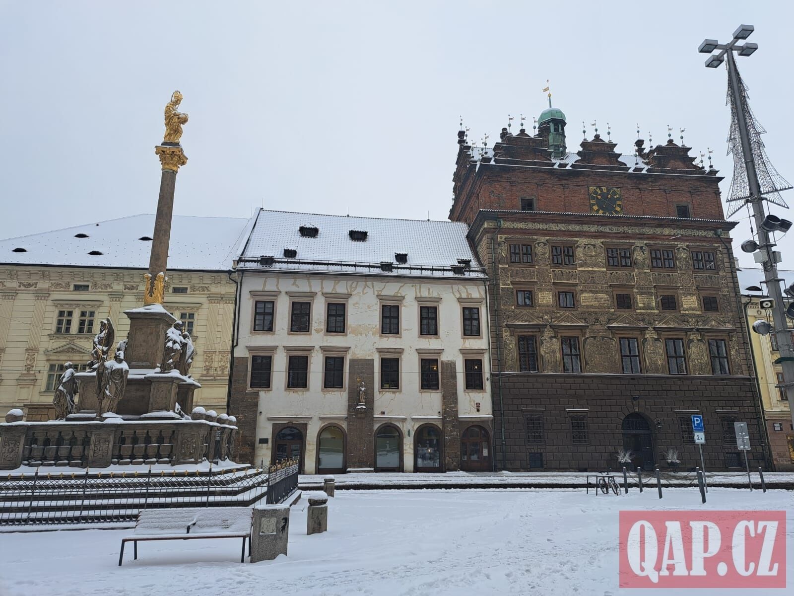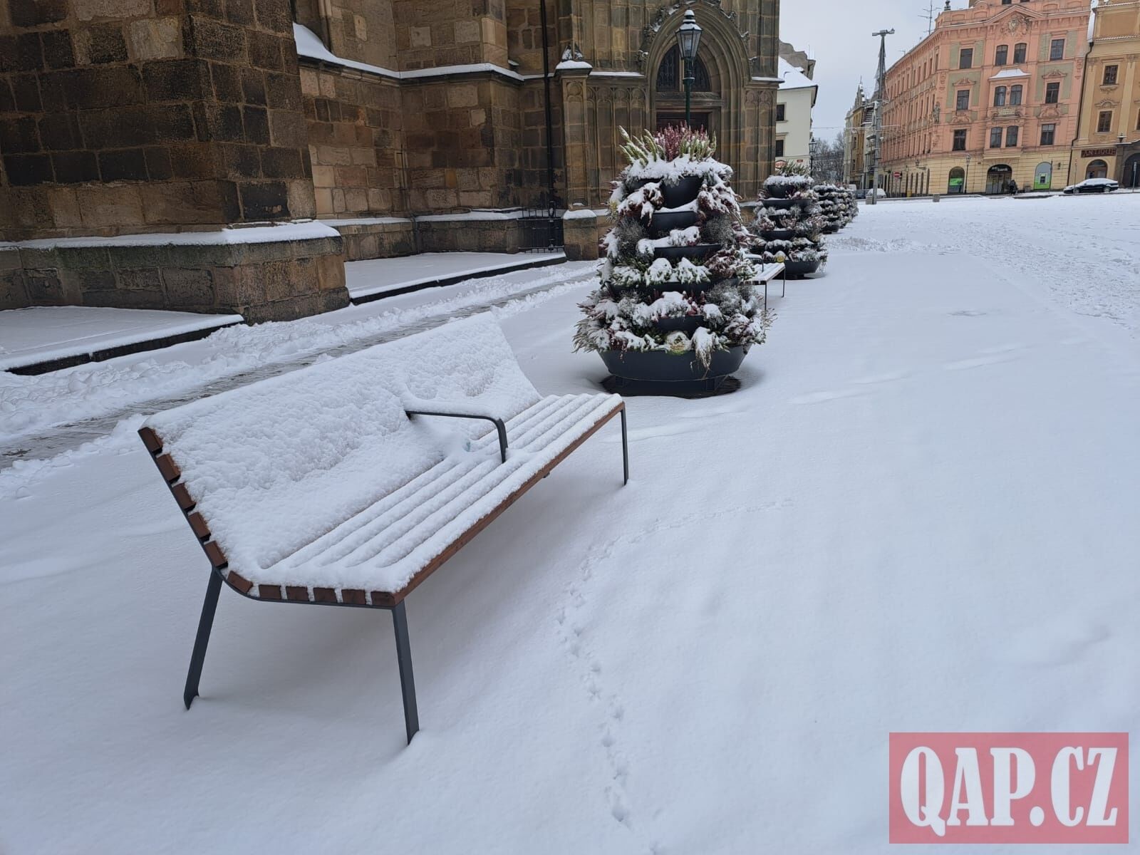V historickém centru Plzně panuje zimní atmosféra. Bílá pokrývka se usadila na lavičkách, stromech a městském mobiliáři, čímž vytvořila scény, které v širším centru působí téměř idylicky.
