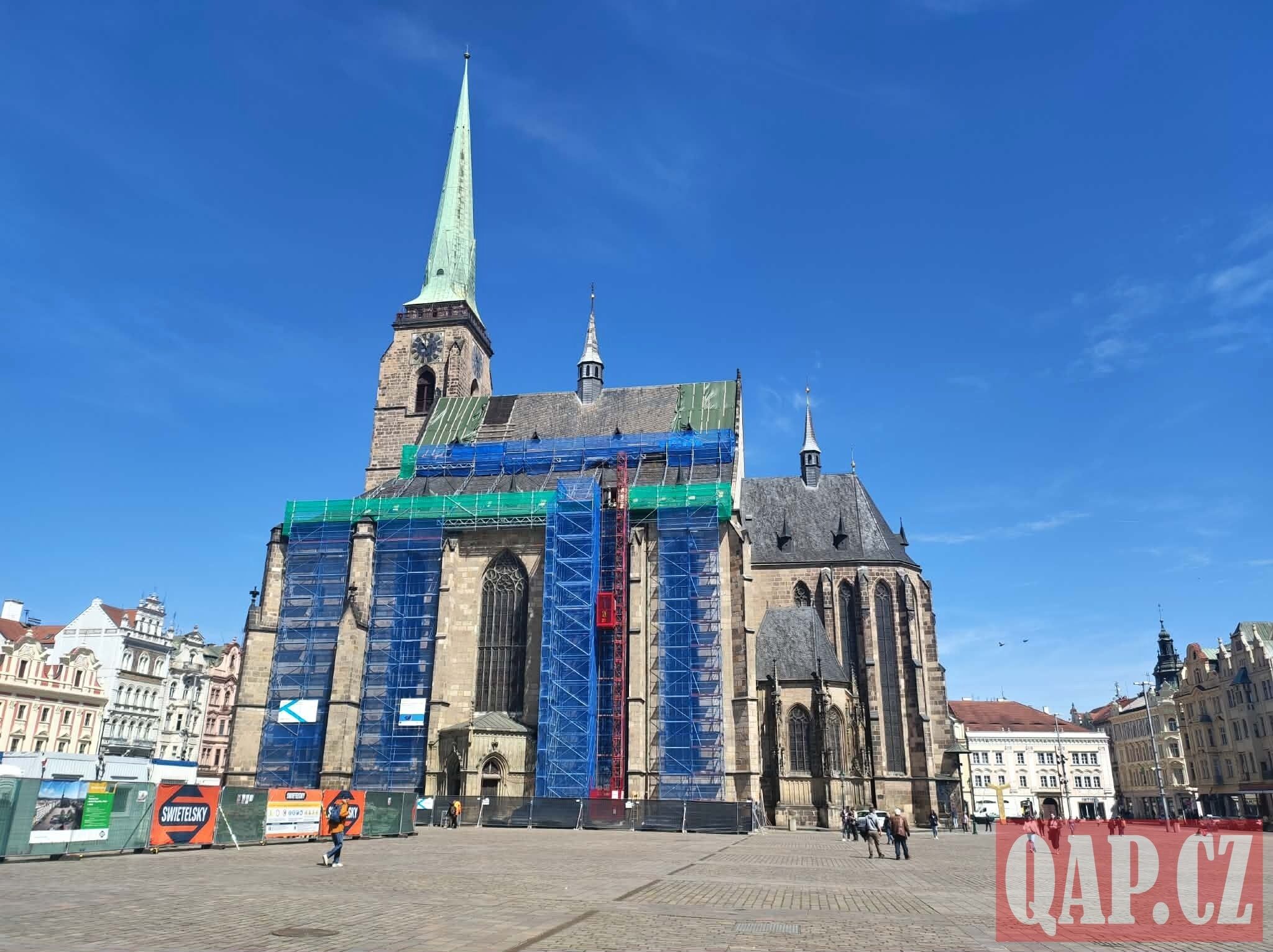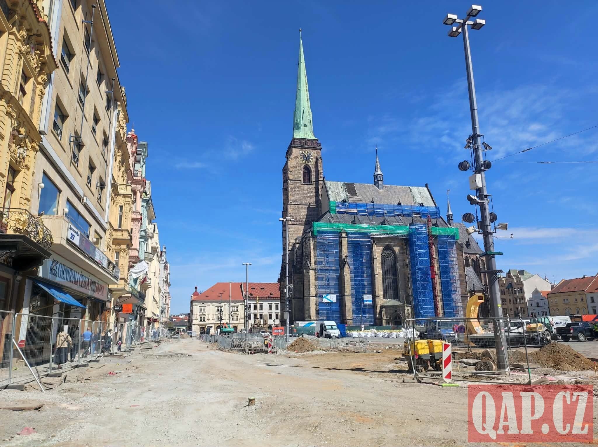 Prostor mezi katedrálou sv. Bartoloměje a biskupstvím je nyní pro veřejnost uzavřen a obehnán zábranami. Zatímco dříve zde parkovala auta a projížděla tranzitní doprava, dnes tu vládnou bagry a stavební technika. Cíl je jasný: do konce léta vytvořit přívětivou zónu se stromy, lavičkami a mlžítky.