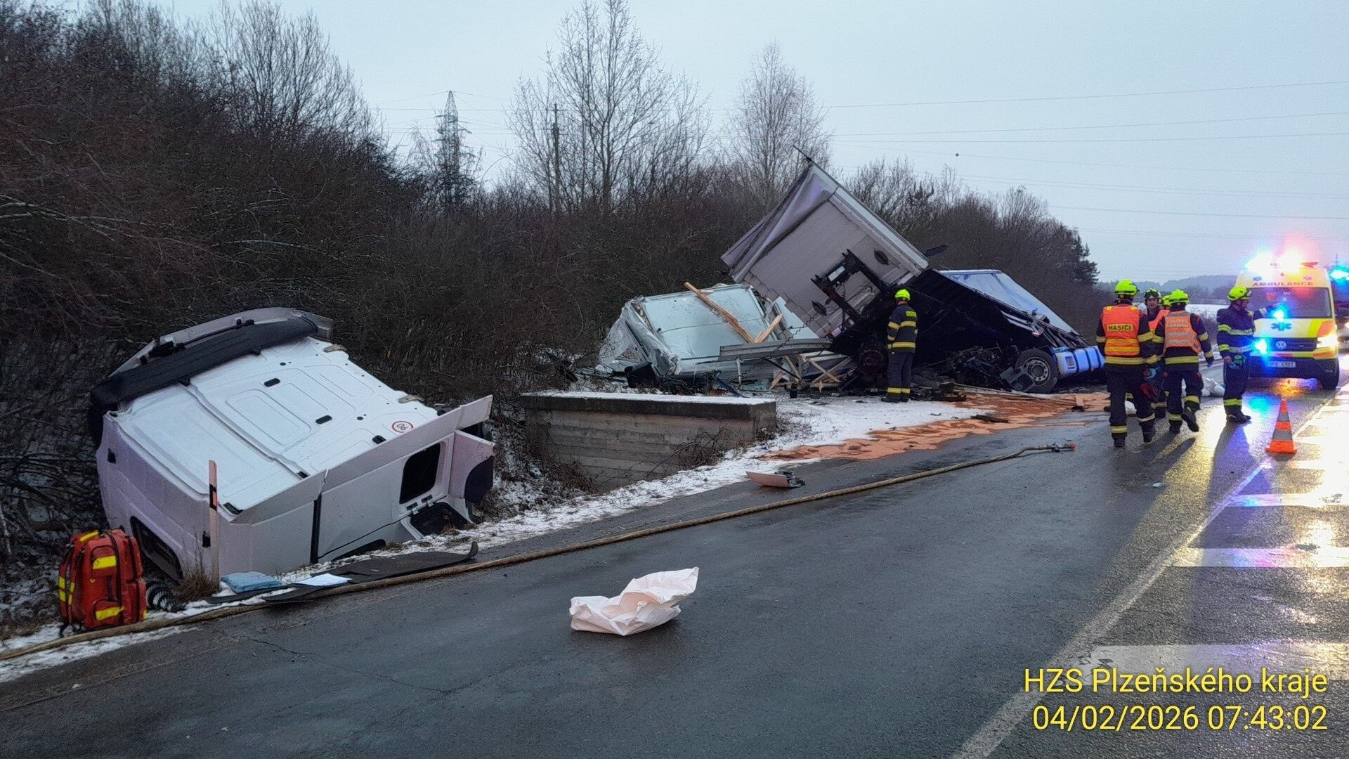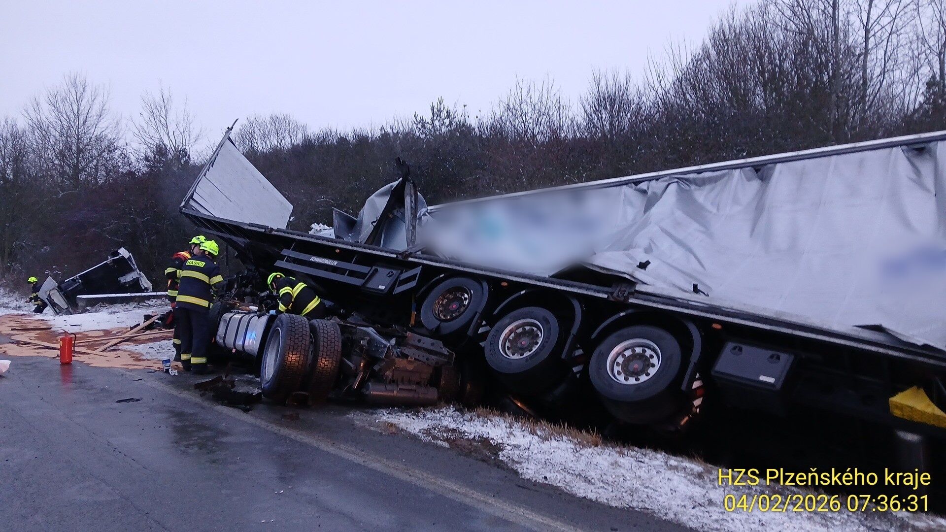 Řidič skončil v nemocnici. „Po vyproštění z kabiny a ošetření našimi záchranáři byl následně transportován lehce zraněný řidič kamionu do Fakultní nemocnice v Plzni na Lochotíně," sdělil Luboš Bouček, mluvčí záchranné služby.