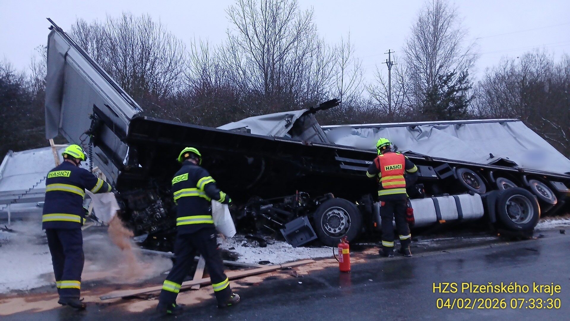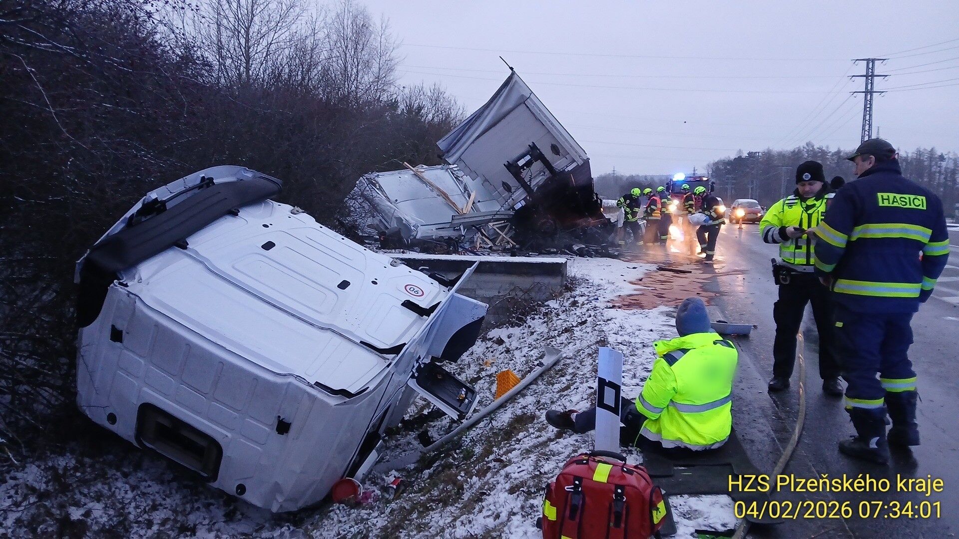 „Hasiči z kabiny vyprostili zraněného řidiče a do příjezdu záchranné služby mu poskytovali předlékařskou pomoc. Souprava nepřevážela nebezpečný náklad, ale při nehodě došlo k úniku přibližně 200 litrů nafty do příkopu,“ popsal zásah mluvčí hasičů Michal Holeček.