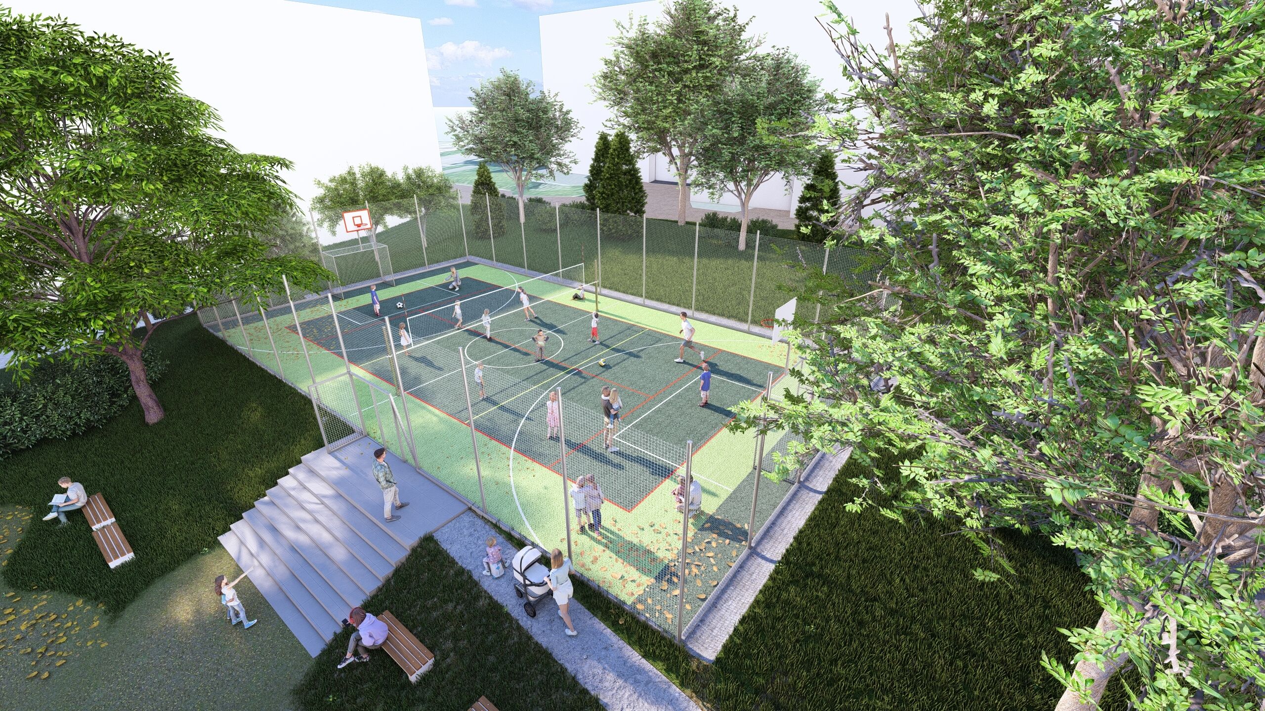 Po celém obvodu hřiště budou instalovány záchytné sítě a chybět nebude ani oplocení. K dispozici budou branky na malou kopanou, dva basketbalové koše a tenisová a volejbalová síť.