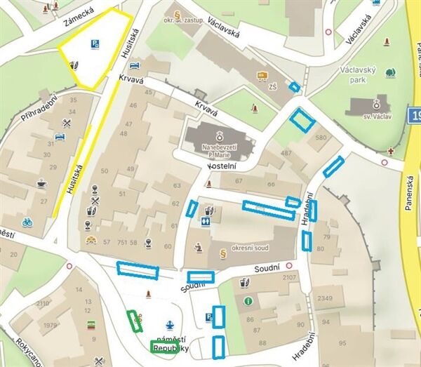 Jedná se o nejvytíženější část města s vyšší regulací parkování. Zahrnuje náměstí Republiky a ulice Soudní, Kostelní, Hradební, K NáměstíPříhradební a Husitská (vč. horního parkoviště).