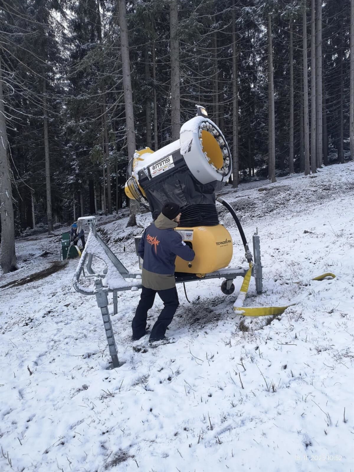 Chladné počasí a pondělní sněžení přispěly zatím přírodní sněhovou pokrývkou do cca 5 cm, nyní se technicky zasněžuje především horní část trojky Slalomové. „Zatím je předčasné avizovat, kdy budeme schopní zahájit provoz,“ doplnil Jan Kasík.