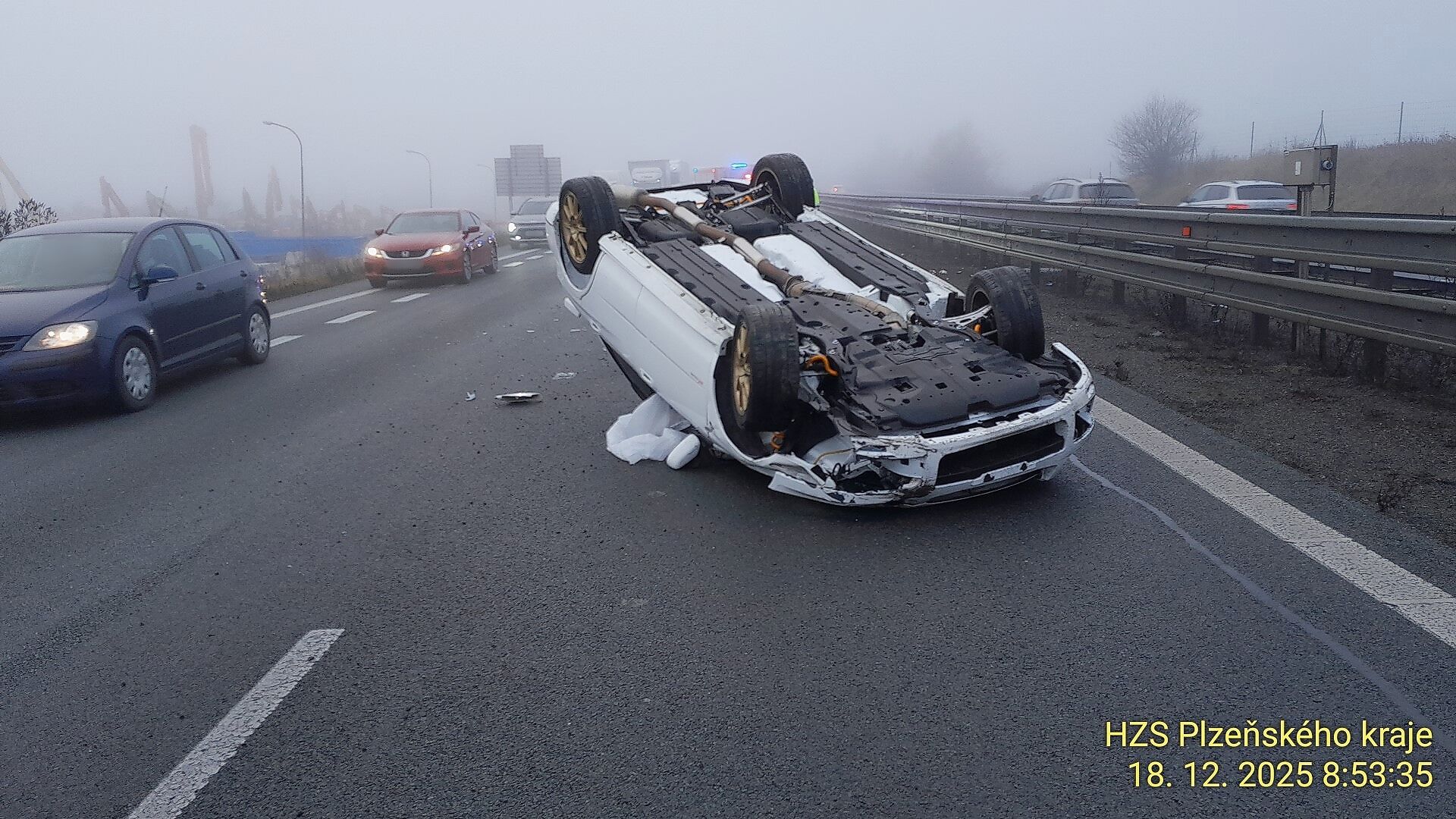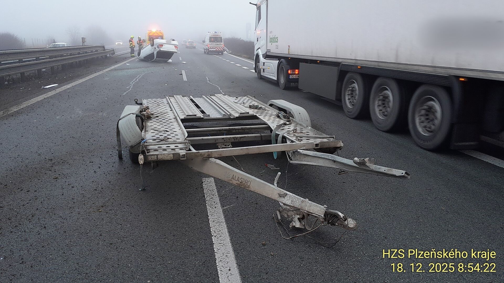 „Jednalo se o havárii osobního automobilu s přívěsem, na kterém bylo převáženo další vozidlo. Tažné vozidlo skončilo mimo těleso dálnice. Jediný účastník nehody se v době příjezdu jednotky nacházel mimo vozidlo a neutrpěl žádná zranění,“ uvedl mluvčí hasičů Michal Holeček.