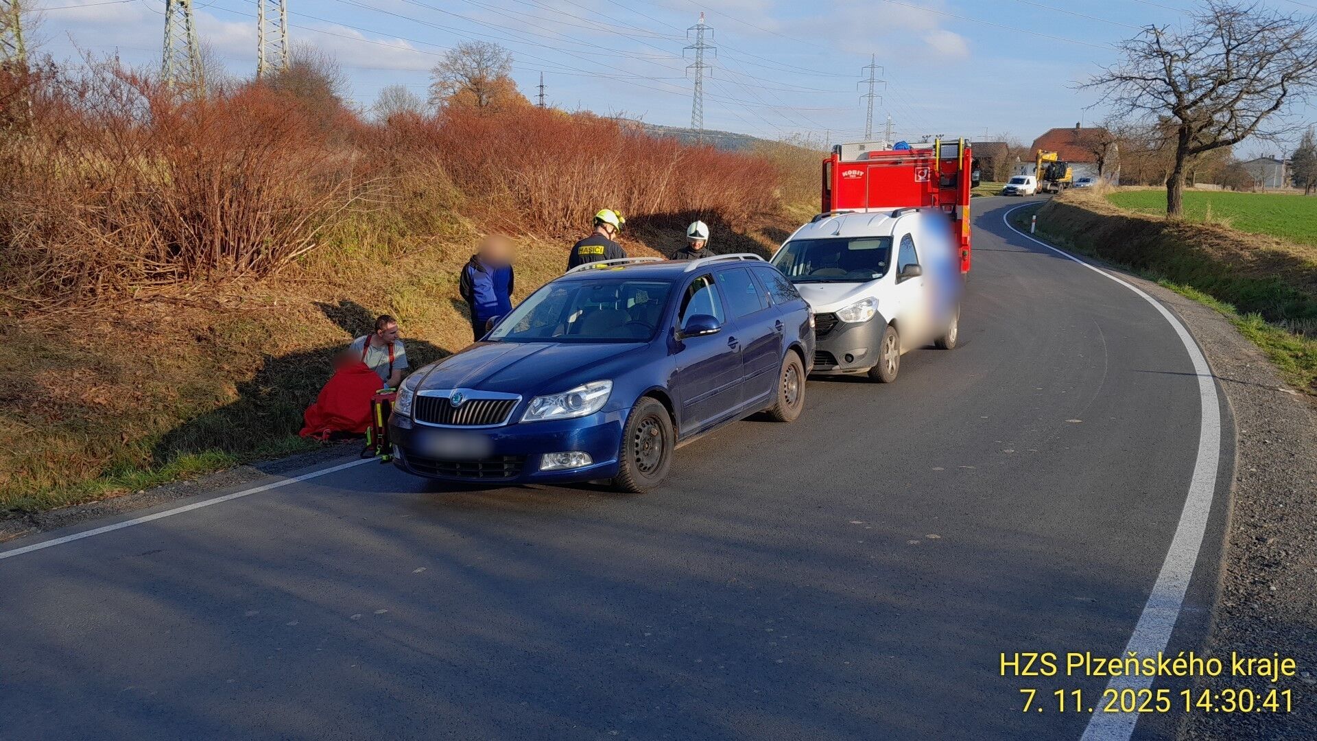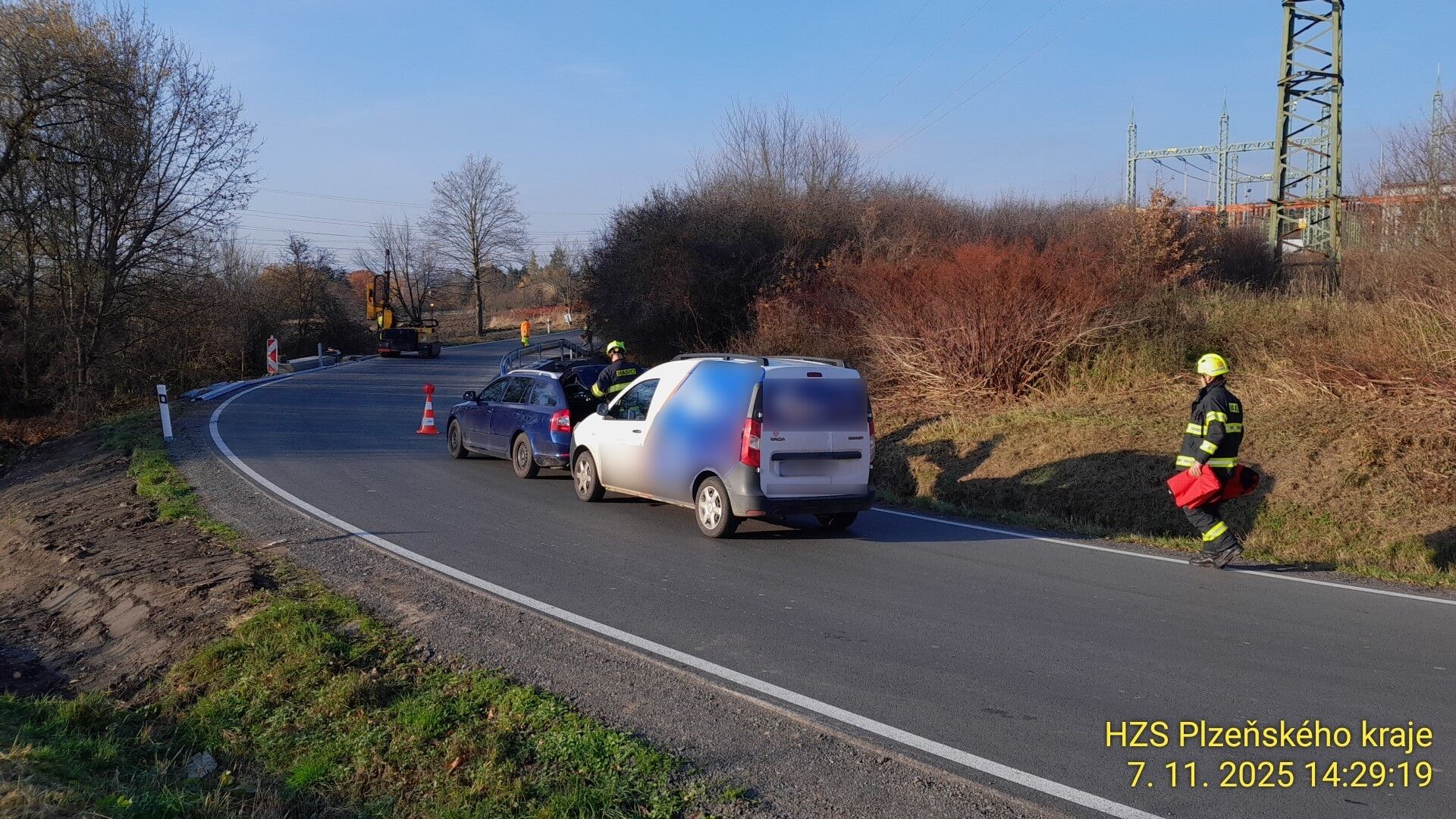 Místo nehody zajistili hasiči. "Došlo k mírnému úniku provozních kapalin, které jsme zajistili, stejně jako protipožární opatření," uvedl dále Michal Holeček.