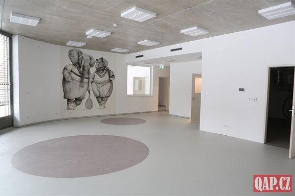 Druhá část je pro dětskou skupinu. „Zahrada té školky musí být oddělena od druhé části a od veřejného parku, proto jsme vymysleli zelenou střechu, kde budou mít děti zahradu s prolézačkou a dalším zázemím,“ uvádí dále architekt. Dbáno je i energetickou úsporu. „Budova je vytápěna tepelným čerpadlem a na střeše máme fotovoltaické panely,“ doplnil Petr Nosek.