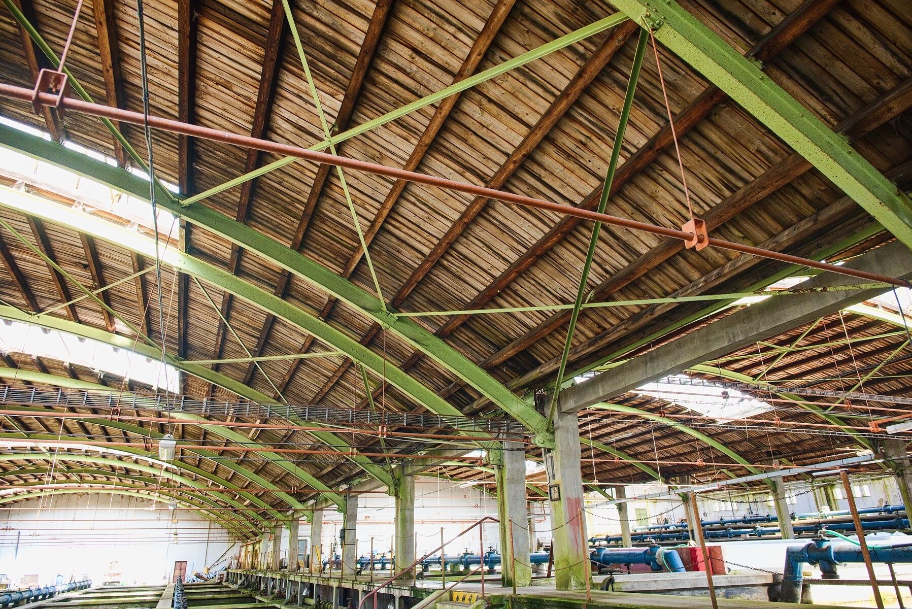 Stávající ocelová konstrukce střechy, vyrobená Škodovými závody, bude zachována a ošetřena a bude provedena kompletní obnova střešního pláště, tedy dřevěných krokví, bednění a krytiny, včetně repase světlíků.