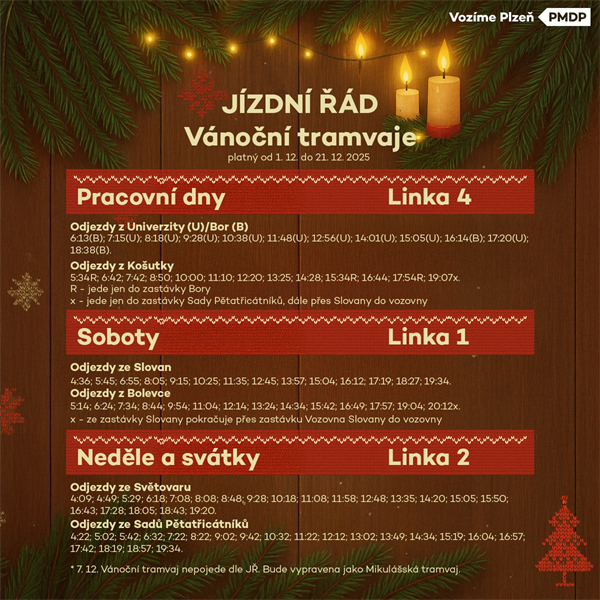 V prosinci bude vánoční tramvaj jezdit pravidelně – v pracovních dnech na lince 4, o sobotách na lince 1 a o nedělích na lince 2. Zjednodušený jízdní řád bude k dispozici na webových stránkách a sociálních sítích PMDP.