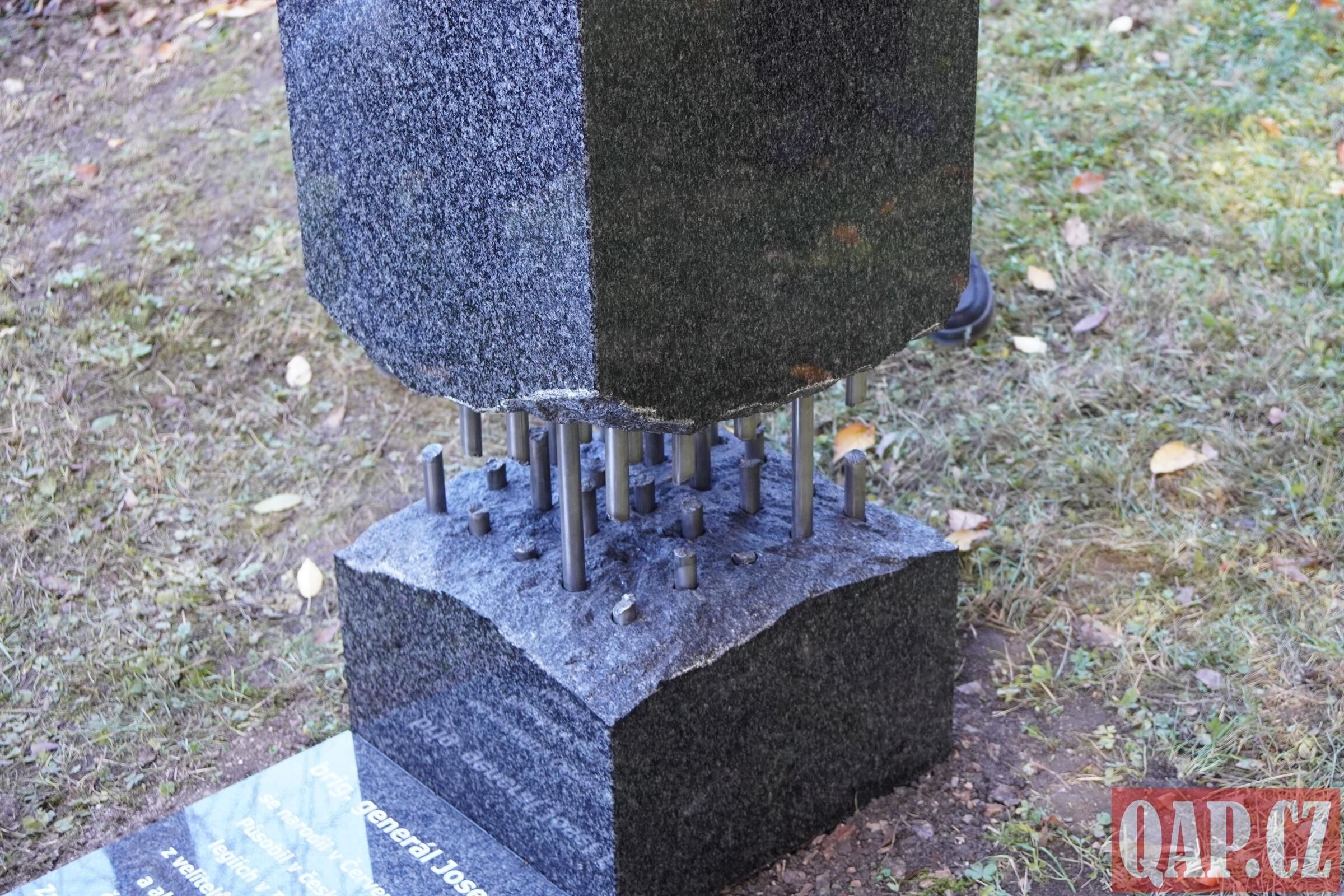 Poté následovalo samotné odhalení památníku. Ten na první pohled zaujme svým uměleckým provedením. Navrhl ho architekt doc. MgA. Luděk Míšek, autor například památníku Jiřímu Trnkovi v Borském parku nebo památníku Ladislavu Sutnarovi. „Památník se skládá ze dvou kvádrů, které jsou protnuty nerezovými tyčemi. Některé tyto tyče jsou přerušené. Tato přerušení symbolizují odtržení pana generála od rodné země a jeho vynucený exil,“ nastiňuje architekt Luděk Míšek.