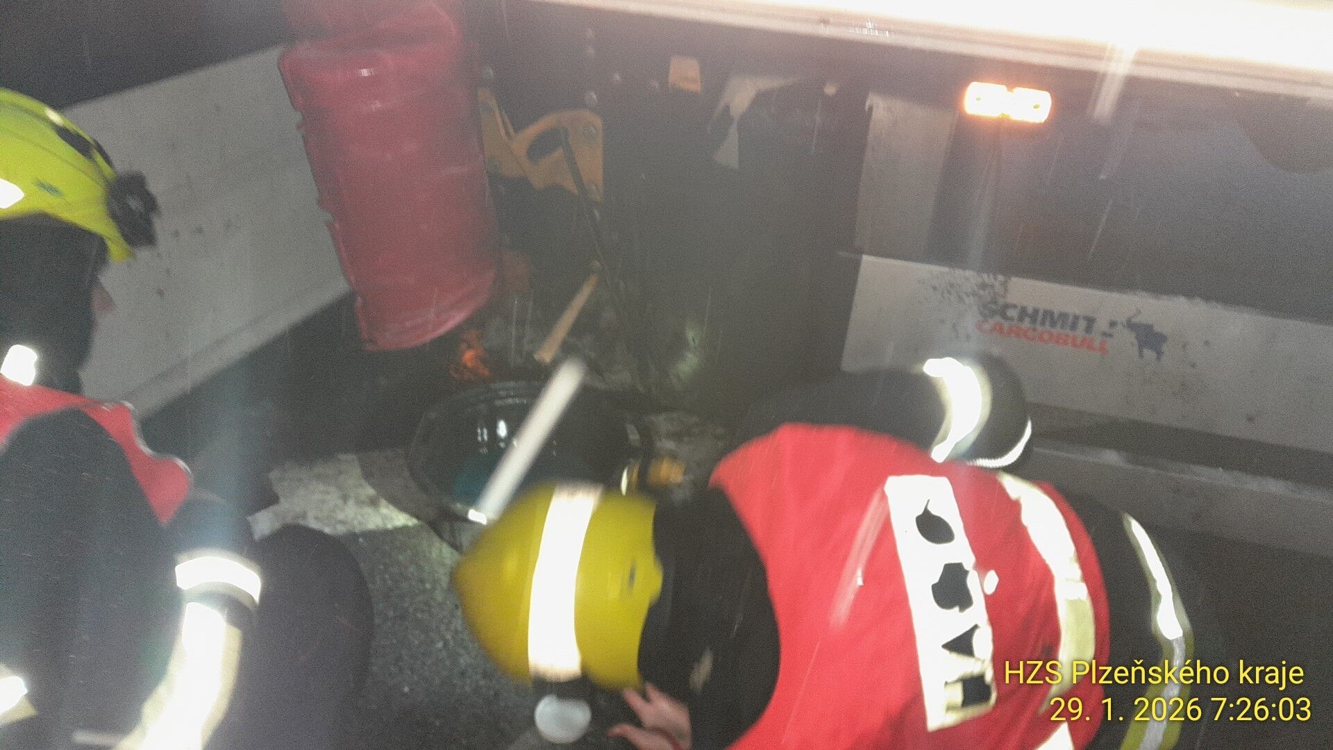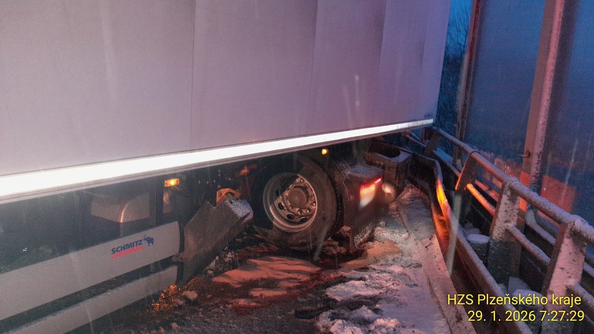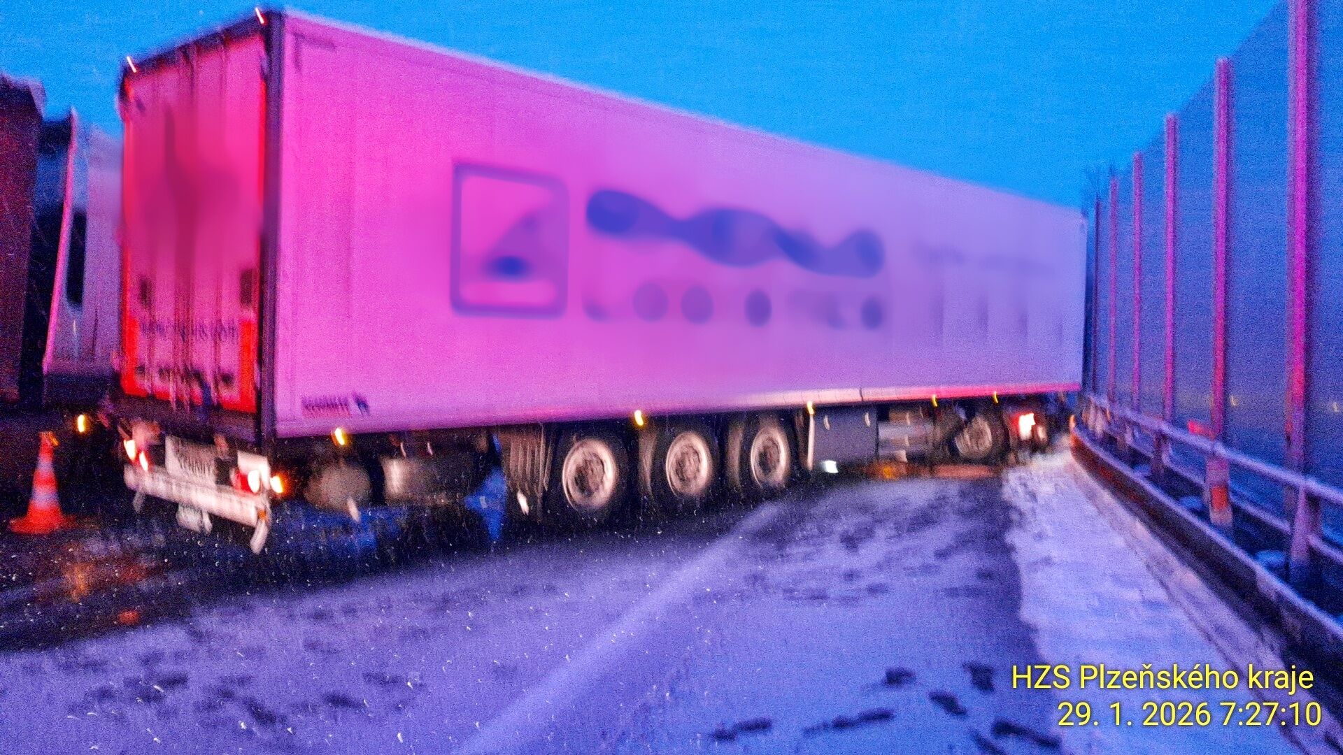 Kolem sedmé hodiny ráno se stala nehoda na dálnici D5. „Na 124. km D5 ve směru na Rozvadov právě zasahujeme u nehody kamionu. Dochází k úniku nafty, který zachytáváme. Dojezd na místo nám komplikovala meteosituace. Nehoda je bez zranění," uvedl Petr Poncar, mluvčí hasičů.