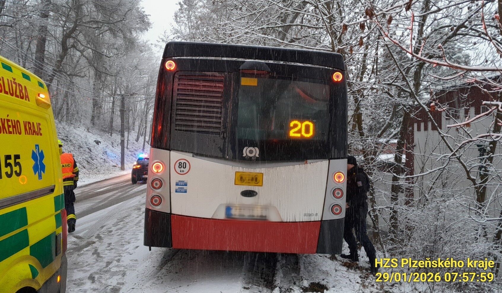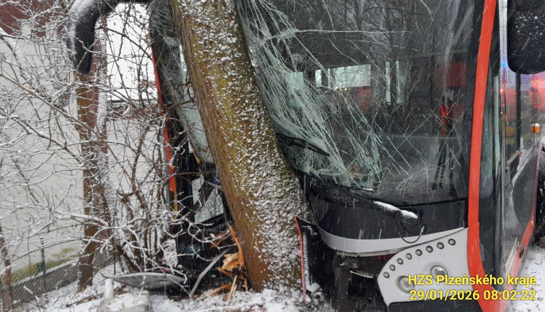 Velké problémy hlásí i plzeňské dopravní podniky. Řada linek v Plzni je zpožděna. Před osmou hodinou ráno narazil autobus do stromu v Plzni v ulici Na Roudné. Podle mluvčího hasičů byly v autobusu dvě osoby, jedna z nich zraněná. Komunikace je v místě zledovatělá.