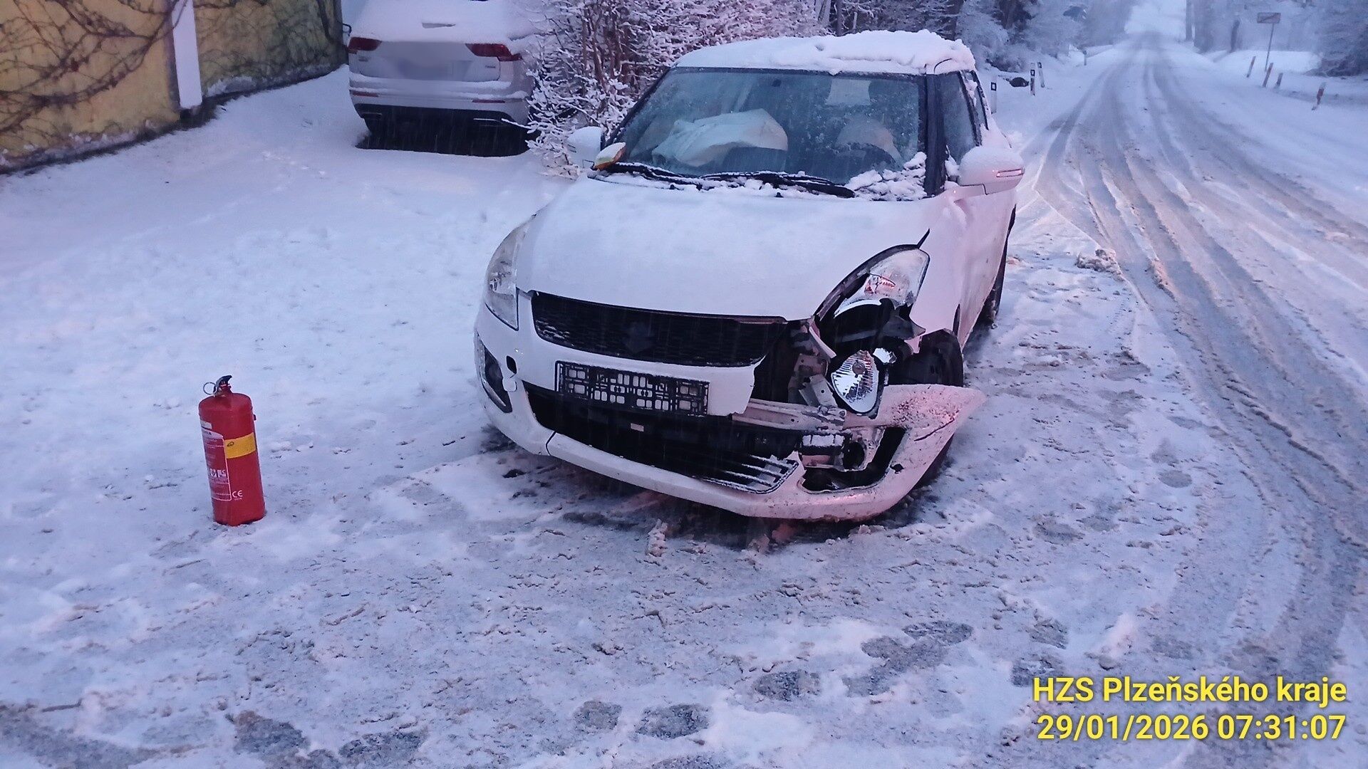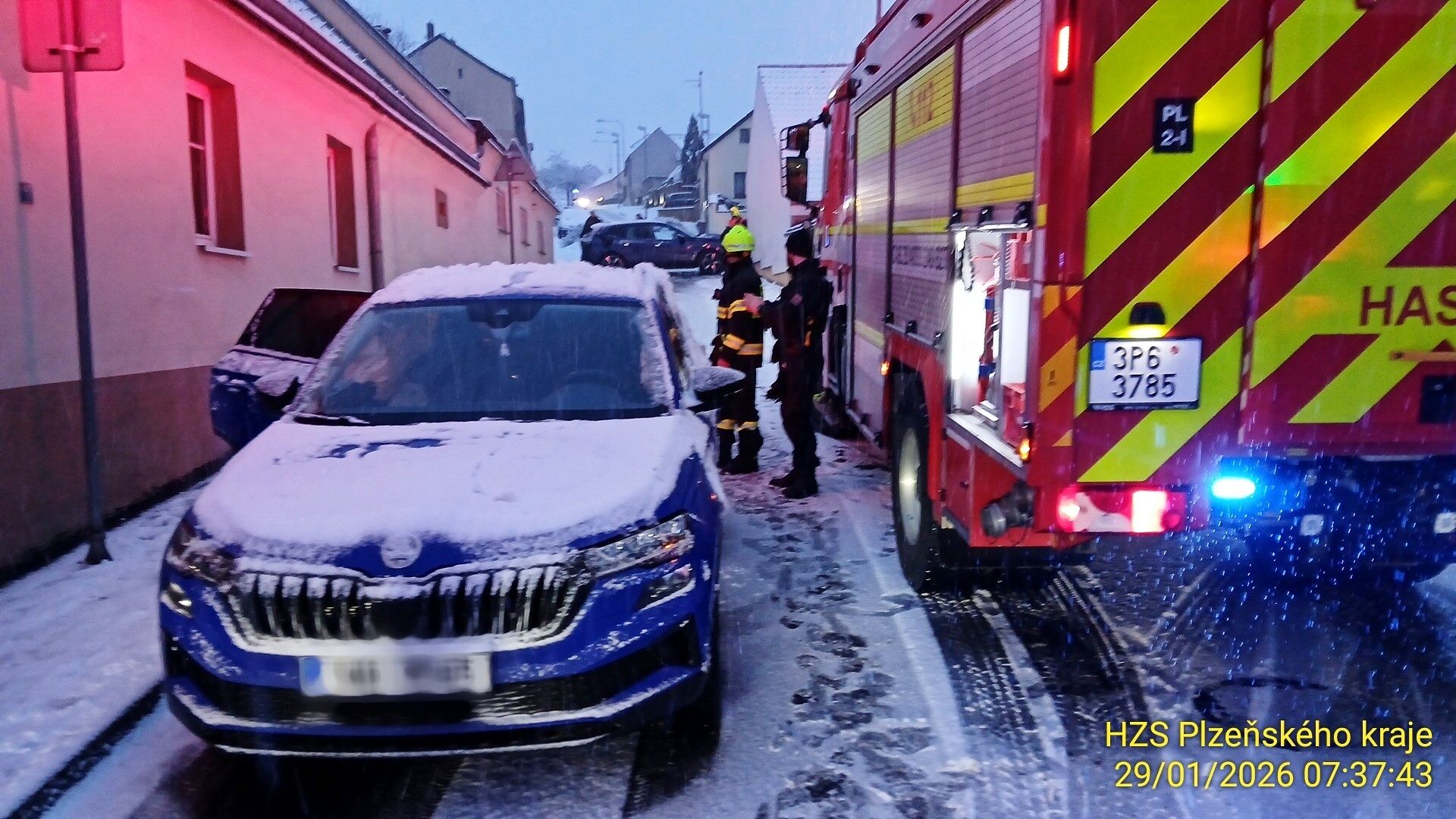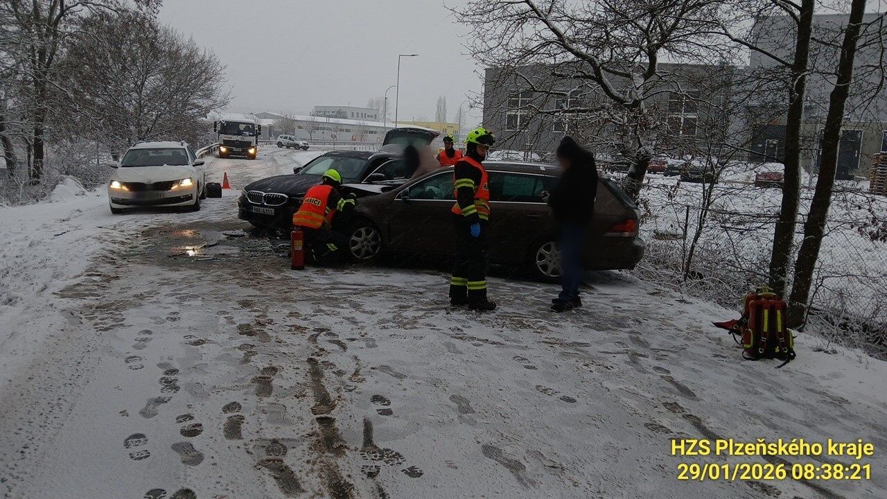 Před půl osmou vyjížděly složky k IZS k nehodě do plzeňského Božkova, dvě osobní vozidla se střetla v ulici K Hrádku.