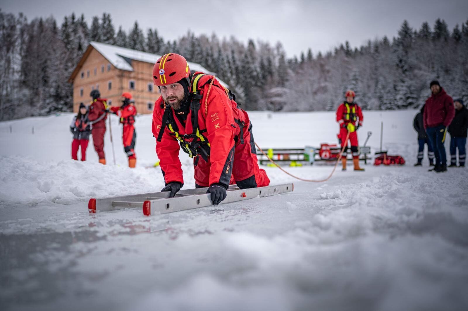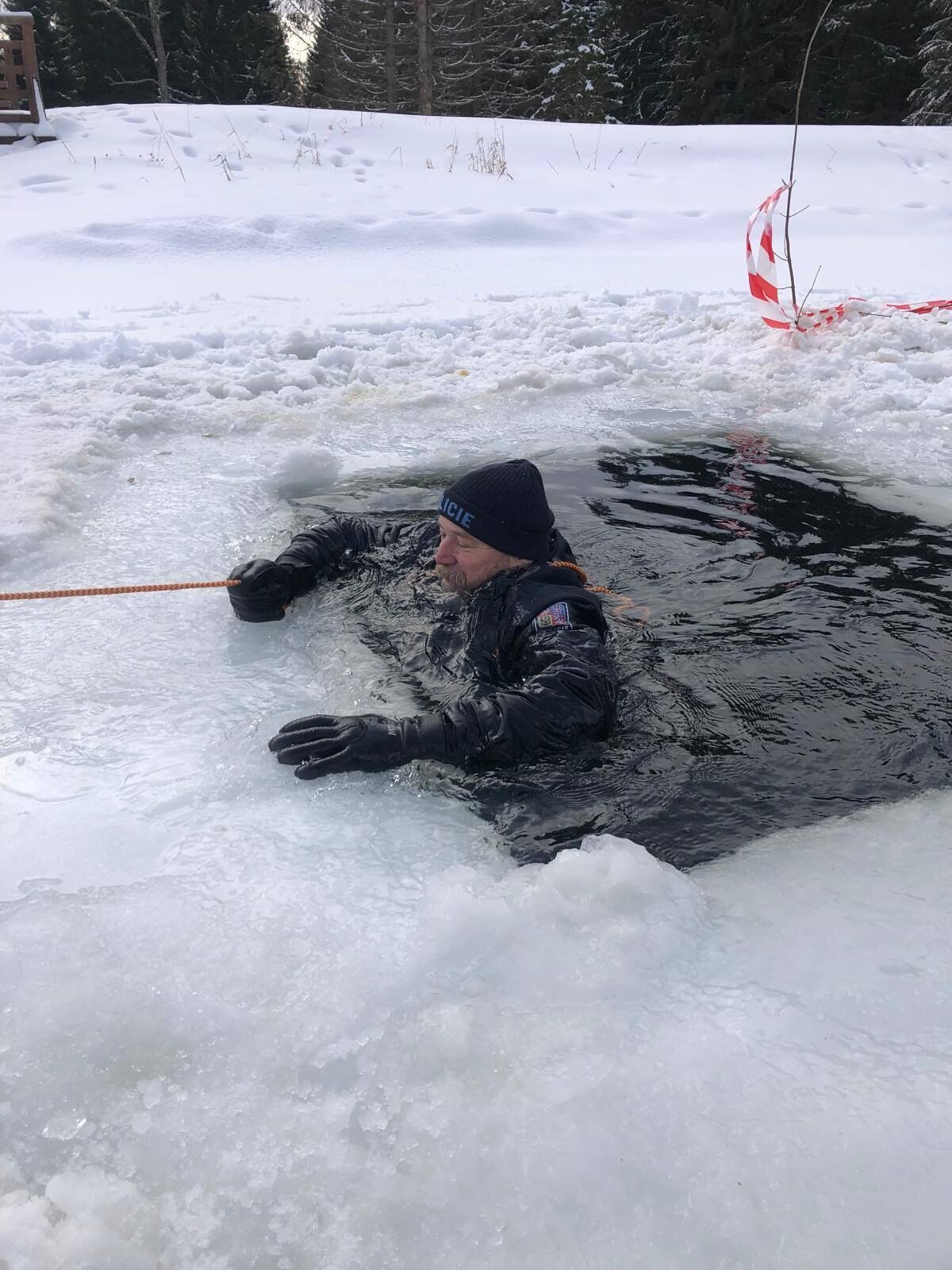 "Policisté Krajského ředitelství policie Plzeňského kraje i v letošním roce na Šumavě nacvičovali společně s Vodní záchrannou službou Plzeň záchranu tonoucích osob z ledové plochy. Dále si minulý týden vyzkoušeli to, jak reagovat při praskání ledu, jak se správně pohybovat po nestabilní zamrzlé ploše či jak se z vody dostat zpět na led," popsal mluvčí policie Ondřej Hodan.