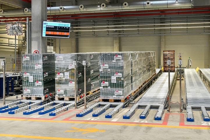 Zboží ze stáčecí linky přepravuje automatický paletový pojízdný systém čítající 28 vozíků, tzv. gondol, které se pohybují po kolejích v celkové délce přes půl kilometru. Lahve a plechovky si přímo ve skladu převezmou automatické jeřábové zakladače. Unikátní samonosný regálový systém uskladní až 16 000 palet, tedy přibližně 18 000 000 piv.