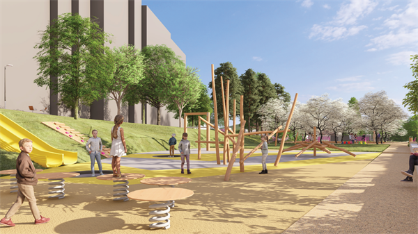 „Navržené řešení respektuje stávající terén, zachováme tedy dvě rovinaté partie v místě původních sportovišť. Plocha je pak zpřístupněna prostřednictvím mlatových cest, které jsou ve svažitých partiích nahrazeny kamennou dlažbou. Horní rovinatá partie původního rozsáhlého sportoviště je využita ke zřízení dětského hřiště s prvky pro menší a střední kategorii dětí, jež využívá i terénního uspořádání prostoru, kam můžeme umístit skluzavky,“ vysvětlila architektka Barbora Nosková.