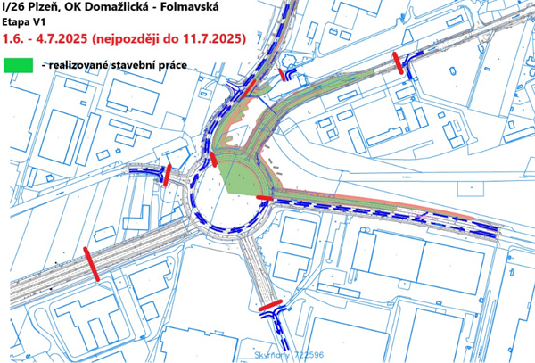 - Etapa V1 – termín 1.6. – 4.7.2025 (nejpozději do 11.7.2025) – stavební práce se budou provádět v severovýchodní části křižovatky, konkrétně realizace prstence okružní křižovatky, příjezdová větev ul. Folmavská, ul. Domažlická (směr centrum) a ul. Regensburská ve směru ke Globusu.