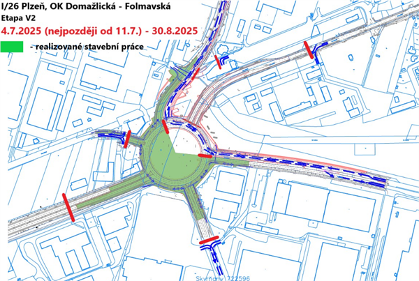 - Etapa V2 - termín 4.7.2025 (nejpozději od 11.7.2025) – 30.8.2025 – stavební práce se budou provádět v jihovýchodní části křižovatky, realizace prstence okružní křižovatky, výjezdová větev ul. Folmavská, ul. Regensburská ve směru ke křižovatce, ul. Obchodní, větev I/26 přivaděč D5 a ul. Domažlická (směr k přivaděči D5).