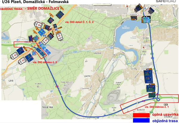 - Směr Domažlice - pro silnici I/26 (přivaděč D5) je objízdná trasa navržena po silnici I/27 ve směru na Klatovy a po dálnici D5 (napojení na MÚK Sulkov - EXIT 89) a opačný směr.