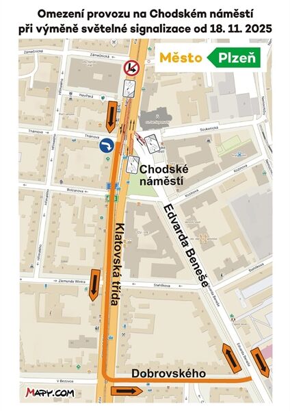 V průběhu rekonstrukce nebude od úterý 18. listopadu možné po určitou dobu odbočovat z Klatovské na Chodské náměstí s pokračováním dále do ulice Edvarda Beneše. Řidiči se do ulice Edvarda Beneše dostanou odbočením do Dobrovského o křižovatku dál.