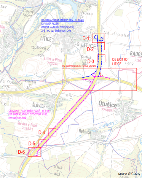 Doprava od Přeštic do Plzně a odbočení na D5 směr Rozvadov: nebude možné přímé odbočení; objízdná trasa s otočením na MÚK Litice
