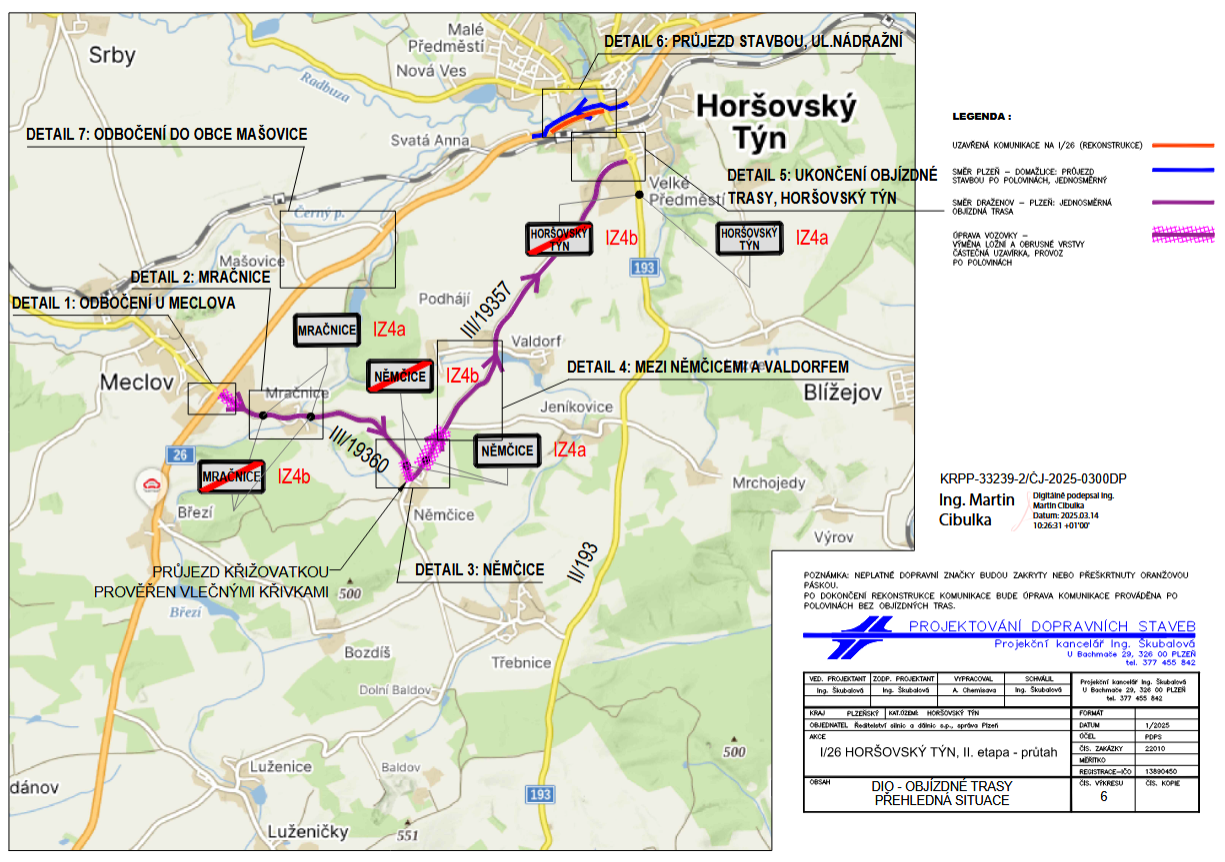 Zatímco ve směru od Plzně na Draženov projedou řidiči stavbou po polovinách vozovky, v opačném směru je situace jiná. Doprava od Draženova na Plzeň bude po celou dobu vedena po jednosměrné objízdné trase. Řidiči budou muset odbočit u obce Meclov na silnici III. třídy a pokračovat přes Němčice a Valdorf až k okružní křižovatce v Horšovském Týně.