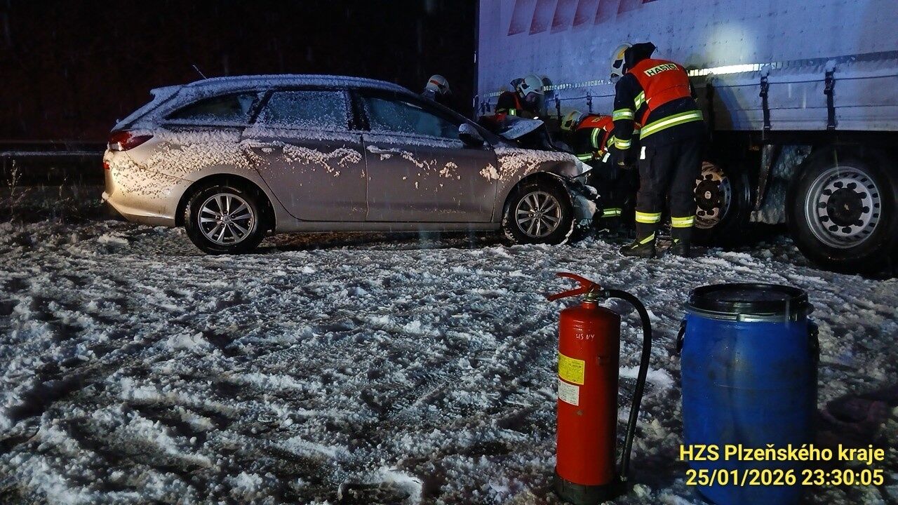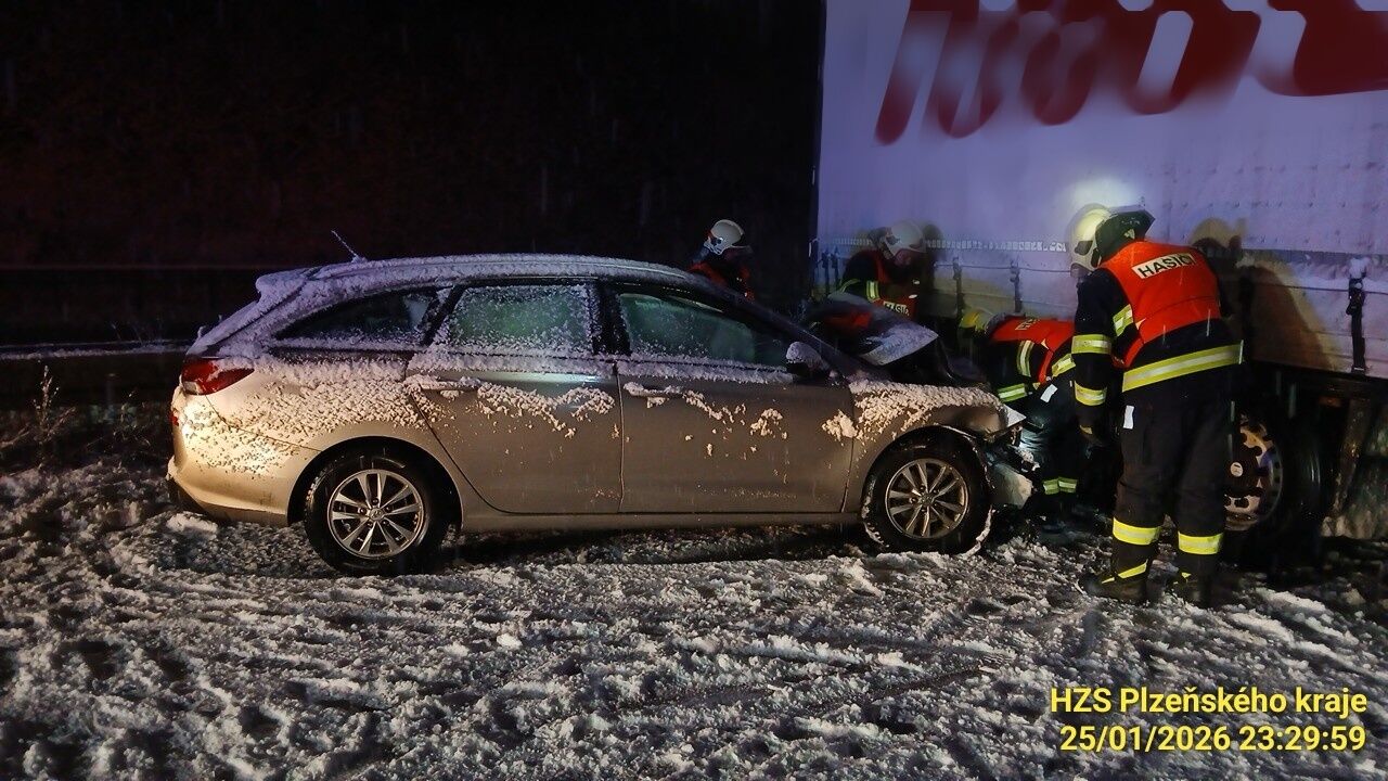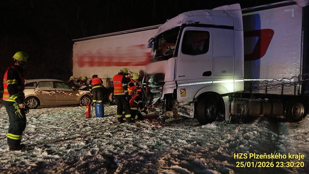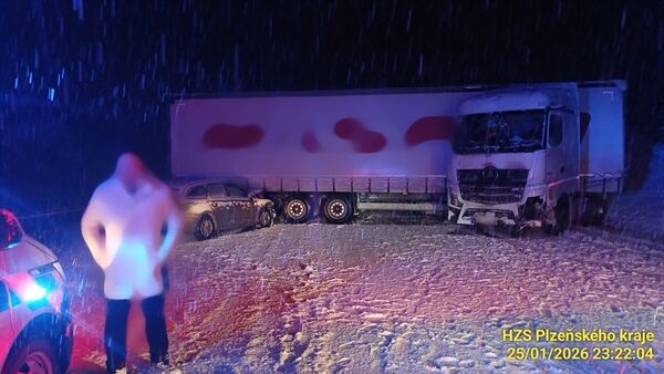 „Zasahovali jsme u nehody kamionu a osobního auta, která zablokovala provoz. Celý zásah nám neulehčovalo počasí, komunikace byly zasněžené a namrzlé. Na místo jsme si museli vyžádat sypač, aby vůbec bylo možné kamion vyprostit,“ popsal komplikovanou situaci mluvčí krajských hasičů Petr Poncar.