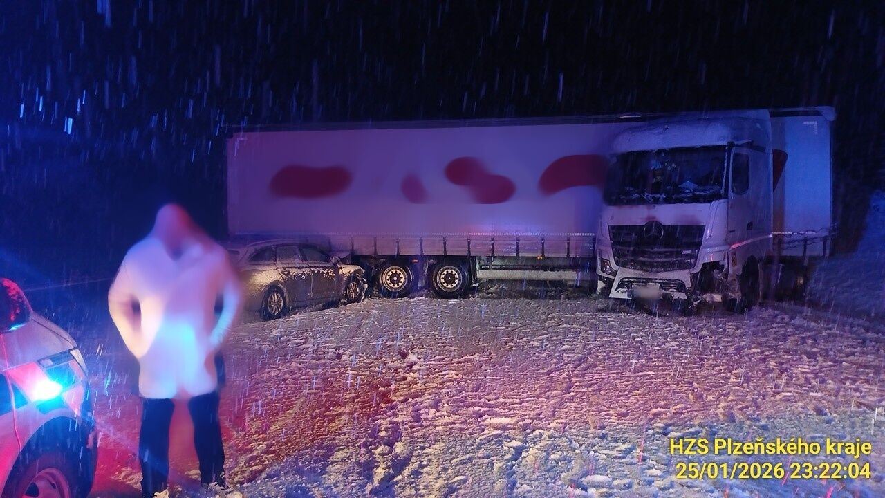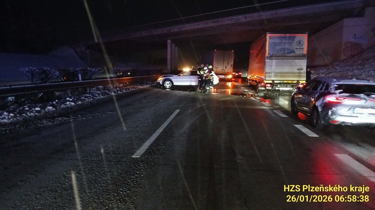 Před sedmou hodinou ranní pak ledovka způsobila další komplikace na dálnici D5, tentokrát u exitu Heřmanova Huť ve směru na Rozvadov. „Zasahujeme u nehody dvou osobních aut a kamionu. Tato událost je naštěstí bez zranění, ale výrazně komplikuje dopravu. Provoz je veden pouze jedním pruhem a komunikace je v místě silně namrzlá,“ varoval Petr Poncar.